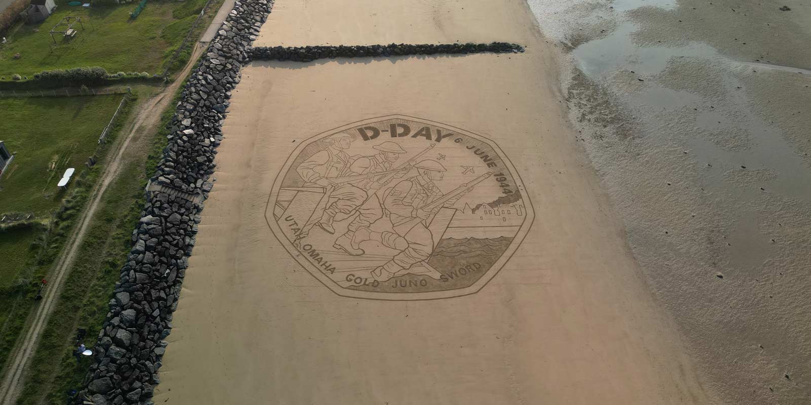To mark the coin’s release, French sand artist Jehan-Benjamin Tarain, with support from Sam Dougados a fellow sand artist, has recreated the D-Day 80 coin design on ‘Gold’ beach, where nearly 25,000 men of the British 50th Division landed. Scaled at 35 metres in diameter, the sand art took 5 hours and 30 minutes to create.