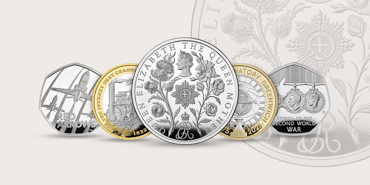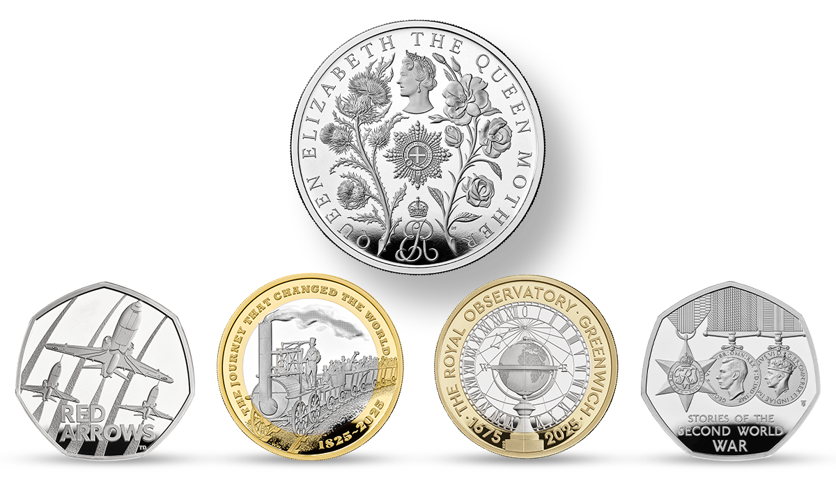 Collect five new commemorative designs honouring Queen Elizabeth The Queen Mother, the modern railway, the Royal Observatory, the Red Arrows and stories of the Second World War.