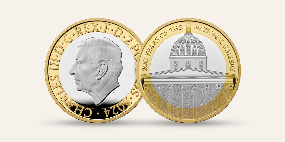 Originally hailing from Australia, Edwina Ellis is a designer, engraver and printmaker who has designed several coins for The Royal Mint, including a UK 50p coin honouring Stephen Hawking and a set of four Bridge £1 coins. The artist has skilfully depicted the National Gallery at the centre of the coin marking its 200th anniversary, with the anniversary itself framing the building in a semi-circle. The edge inscription reads ‘MAIORVM GLORIA POSTERIS LVMEN EST’, which means ‘The glory of our ancestors is a light to our descendants’ and is inscribed on the ceiling above the main staircase in the Wilkins Building of the Gallery. The phrase conveys the notion that the great artists of the past inspire those of the future – a founding principle of the National Gallery.