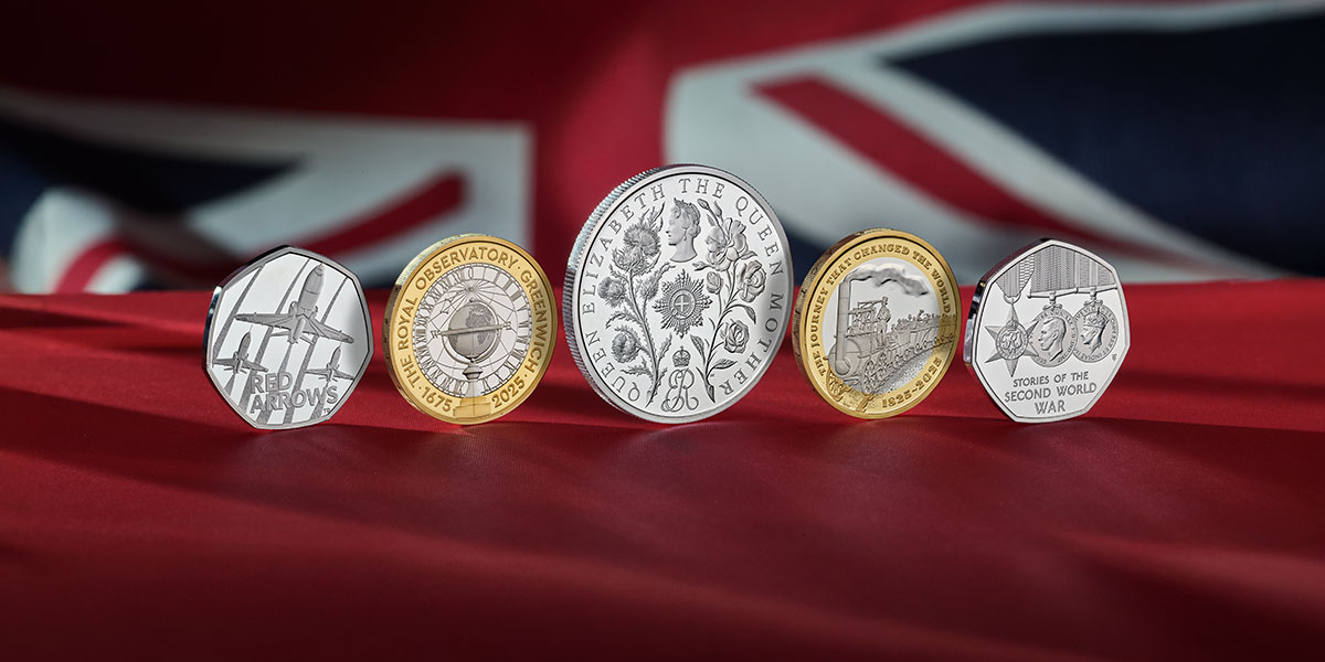 Featuring five brand-new commemorative coins, the 2025 Annual Sets feature stunning designs honouring the life and legacy of Queen Elizabeth The Queen Mother, 200 years of the modern railway, 350 years of the Royal Observatory, Greenwich, the enduring success of the Red Arrows and stories of the Second World War.