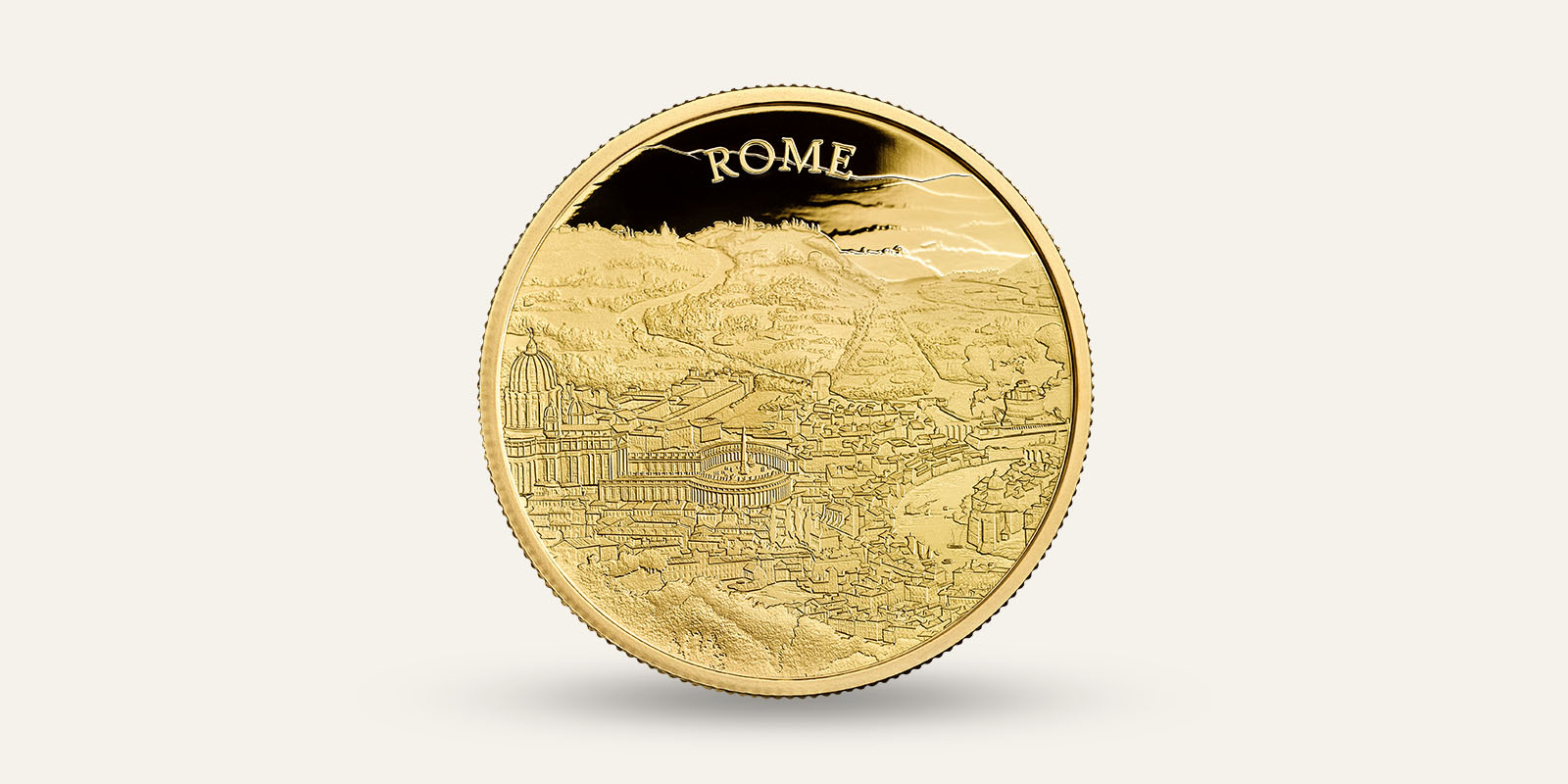 Our City Views coin dedicated to Rome features a reverse design based on a nineteenth-century piece by the French artist Jacques Alphonse Testard (b.1810) who captured the city’s sprawl from atop Janiculum Hill. Known as Rome’s eighth hill, this peaceful spot offers a spectacular panorama of the historical buildings and monuments that form this iconic skyline. A popular postcard scene, the hill has inspired many famous artists to paint the view from this vantage point, including Joseph Turner.