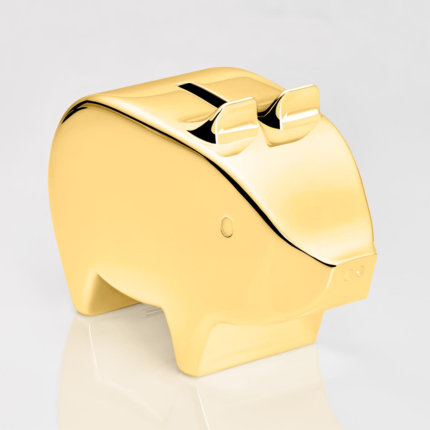 Introducing the world's most luxurious piggy bank. 18ct Yellow Gold Minty® is hand-crafted by highly skilled British artisan goldsmiths using The Royal Mint's trademark Minty® design. Indulgent, opulent and stunningly beautiful, the flawless mirror finish highlights that this is no ordinary piggy bank but a unique example of quality and design. Designed by Kamal Peshawaria, Minty's contemporary look is beautifully complimented by the shimmer on the 18ct gold.
