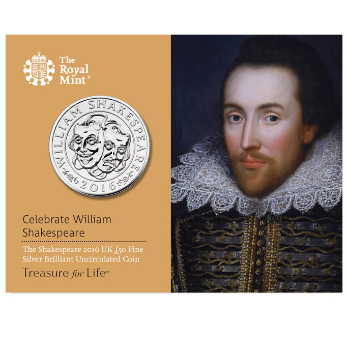 In 2016 we celebrate a momentous cultural milestone, marking 400 years since the death of William Shakespeare. The Royal Mint is proud to strike a range of coins which celebrate every aspect of the man and his timeless words. These coins have been endorsed by world-leading experts at the Shakespeare Birthplace Trust and are the only official United Kingdom coins to mark this anniversary. This £50 coin is struck in fine silver to Brilliant Uncirculated standard.