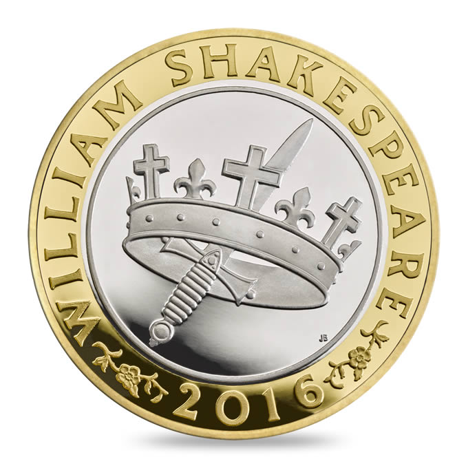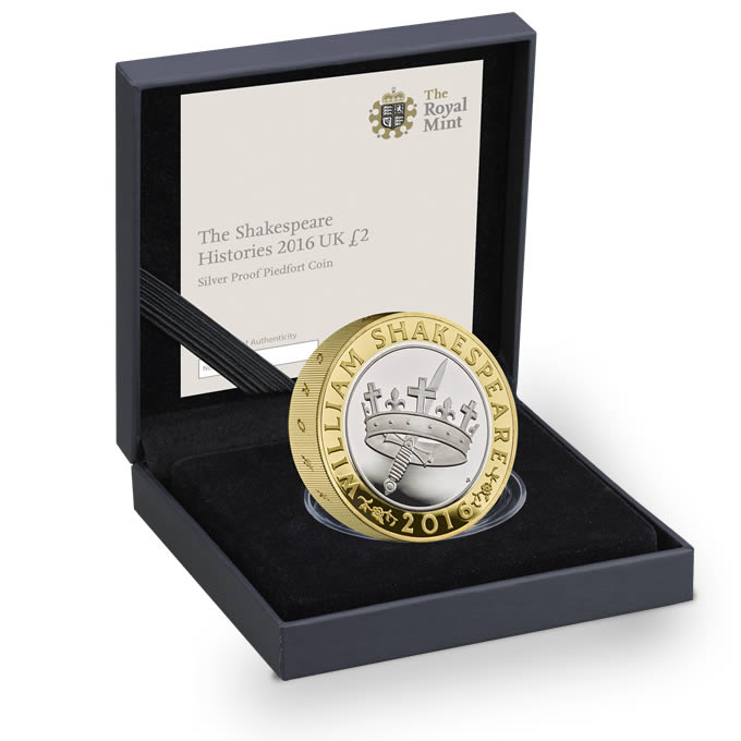 William Shakespeare remains one of the greatest writers of all time, and it is fitting that three £2 coins mark the 400th anniversary of his death. They feature a series of designs by seasoned coinage artist, John Bergdahl, celebrating Shakespeare's most famous works. This double-thickness Piedfort coin represents the histories, such as the 'Richard' plays, which inspire the accompanying booklet, created with the help of the Shakespeare Birthplace Trust.