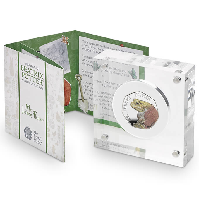 This 925 sterling silver coin showcases how effective colour printing can be. The tiniest details, like Jeremy’s smart jacket and shovel, have been highlighted by the technique, and enhanced by the coin’s Proof finish. The coin comes in a clear acrylic presentation case with a booklet on the famous frog and his adventures.