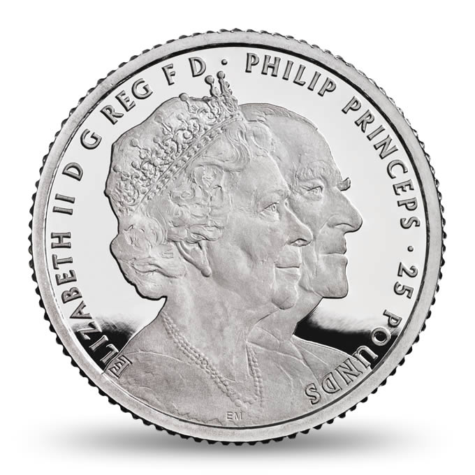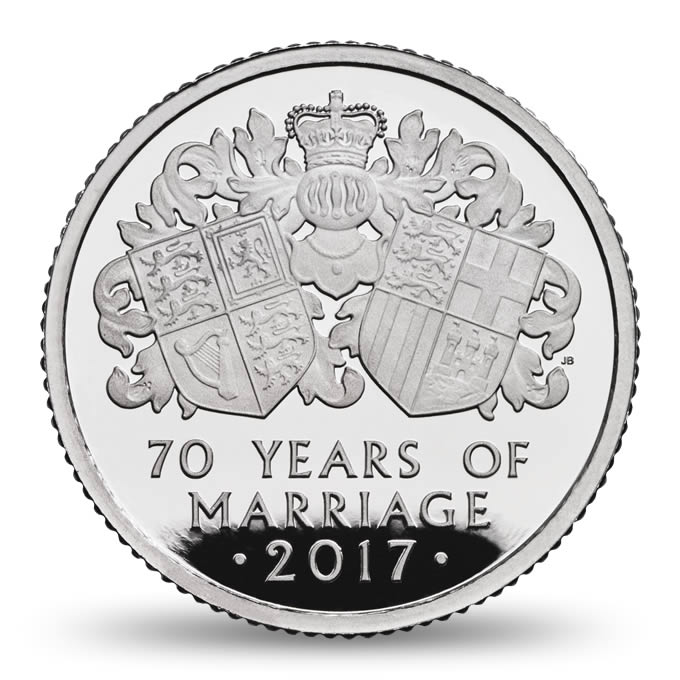 Platinum has a symbolic role in the royal couple’s story. This quarter-ounce platinum coin’s Proof finish emphasises every detail of two new designs created to mark their 70th wedding anniversary. Etienne Millner’s combined portrait graces the obverse, while John Bergdahl’s double shield design features the heraldic lineage of the two families that became entwined when the couple married.