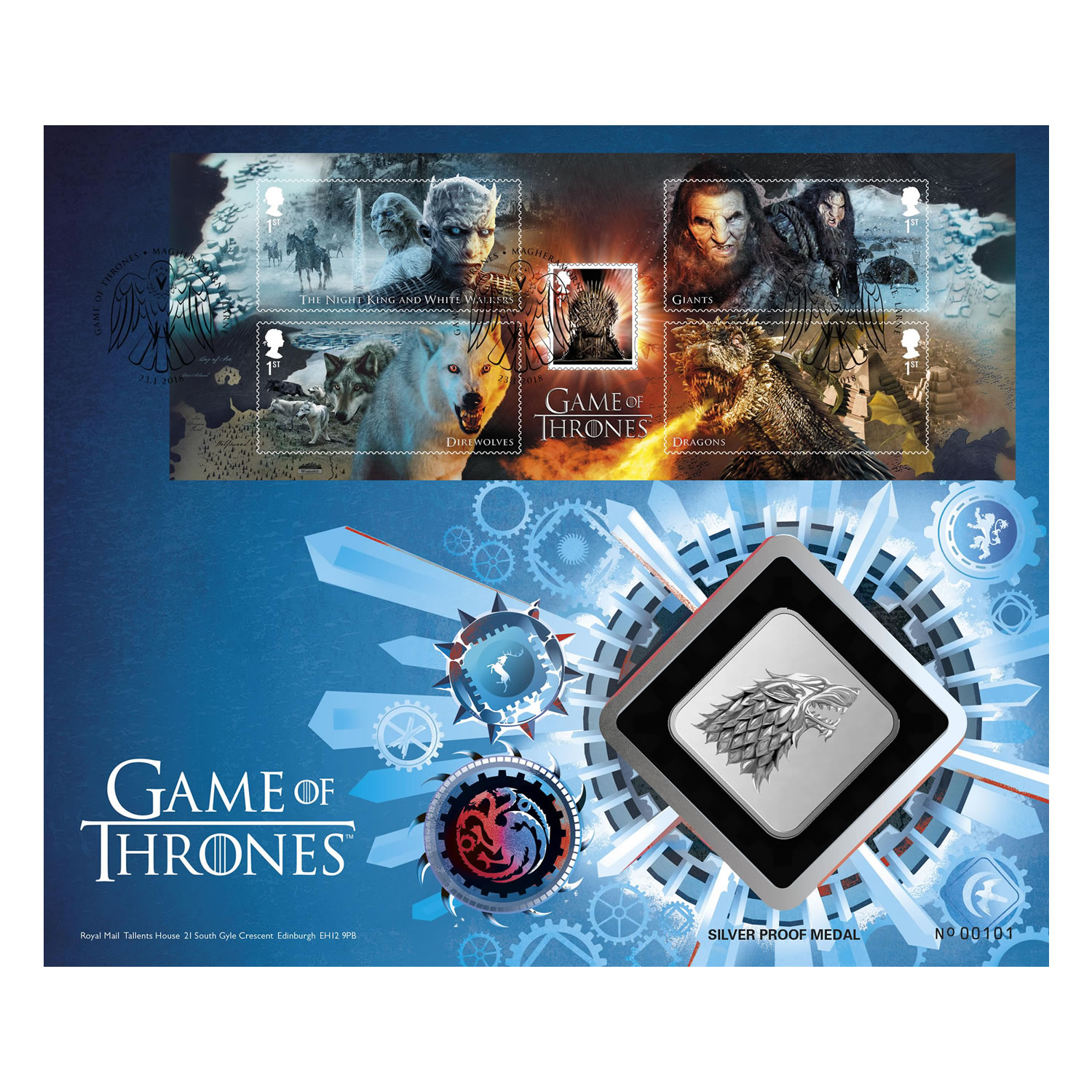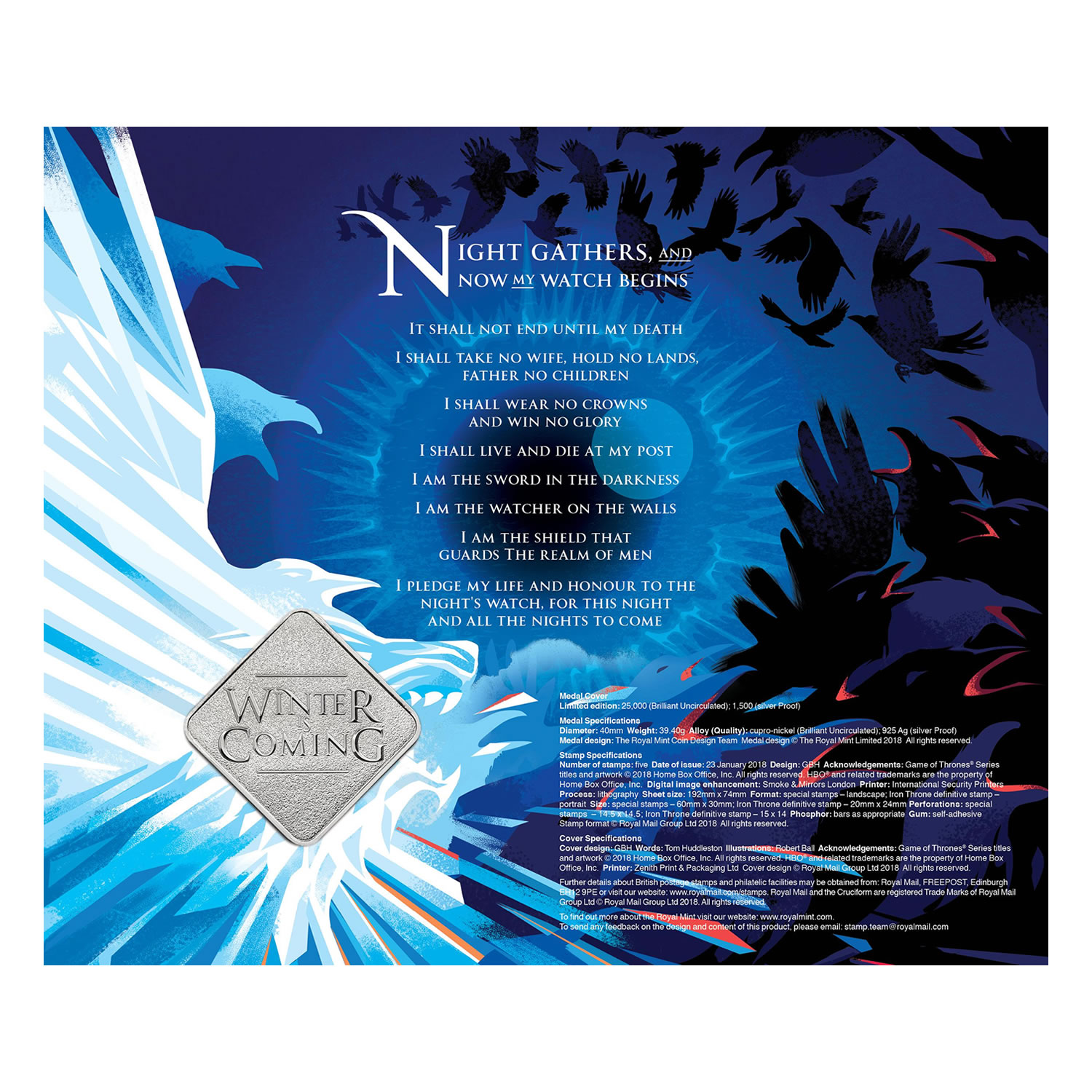 With the great houses of Westeros preoccupied, dark forces stir north of the Wall. Gone for thousands of years, the White Walkers are legend no more. The Long Night is set to return. Only by uniting for the greater good, do the living stand any chance. As Game of Thrones gears up for its epic conclusion, Royal Mail has produced a stamp cover celebrating one of the show’s key themes – ice. Royal Mail’s striking stamps are accompanied by a specially commissioned Royal Mint silver Proof medal. This limited edition cover features a stamp sheet including five stamps and an information card written by Game of Thrones expert Tom Huddlestone. Learn more about the dark forces north of the Wall - all that stands between Westeros and The Night King’s undead horde. Each cover contains a hallmarked, silver Proof medal designed exclusively for this product. The obverse of the medal showcases a direwolf design, the sigil of House Stark, while the reverse features one of the show’s signature quotes – ‘Winter is Coming’. The stamps are cancelled by an exclusive handstamp depicting the Three-Eyed Raven, uniquely tying these stamps to the cover.