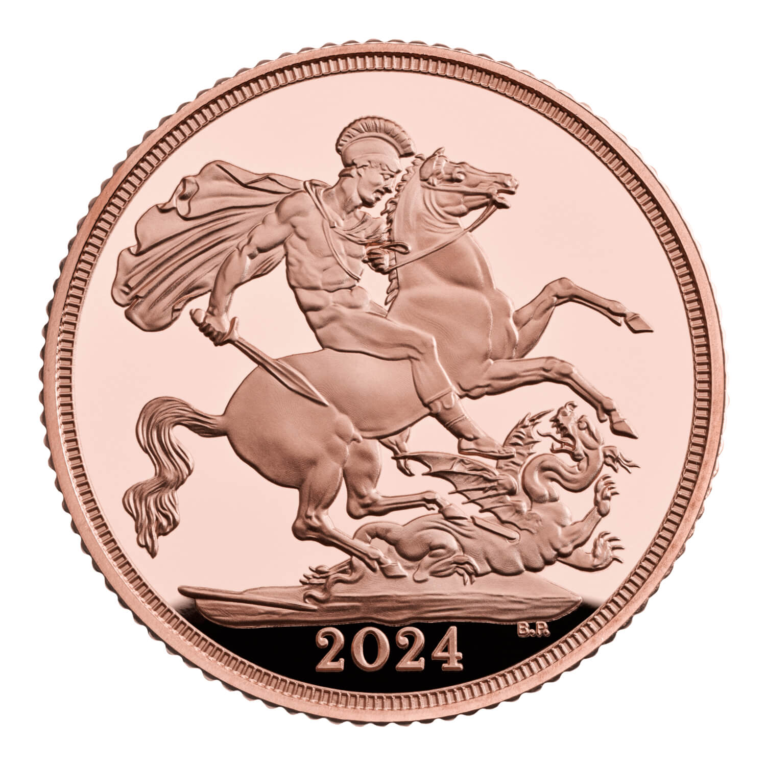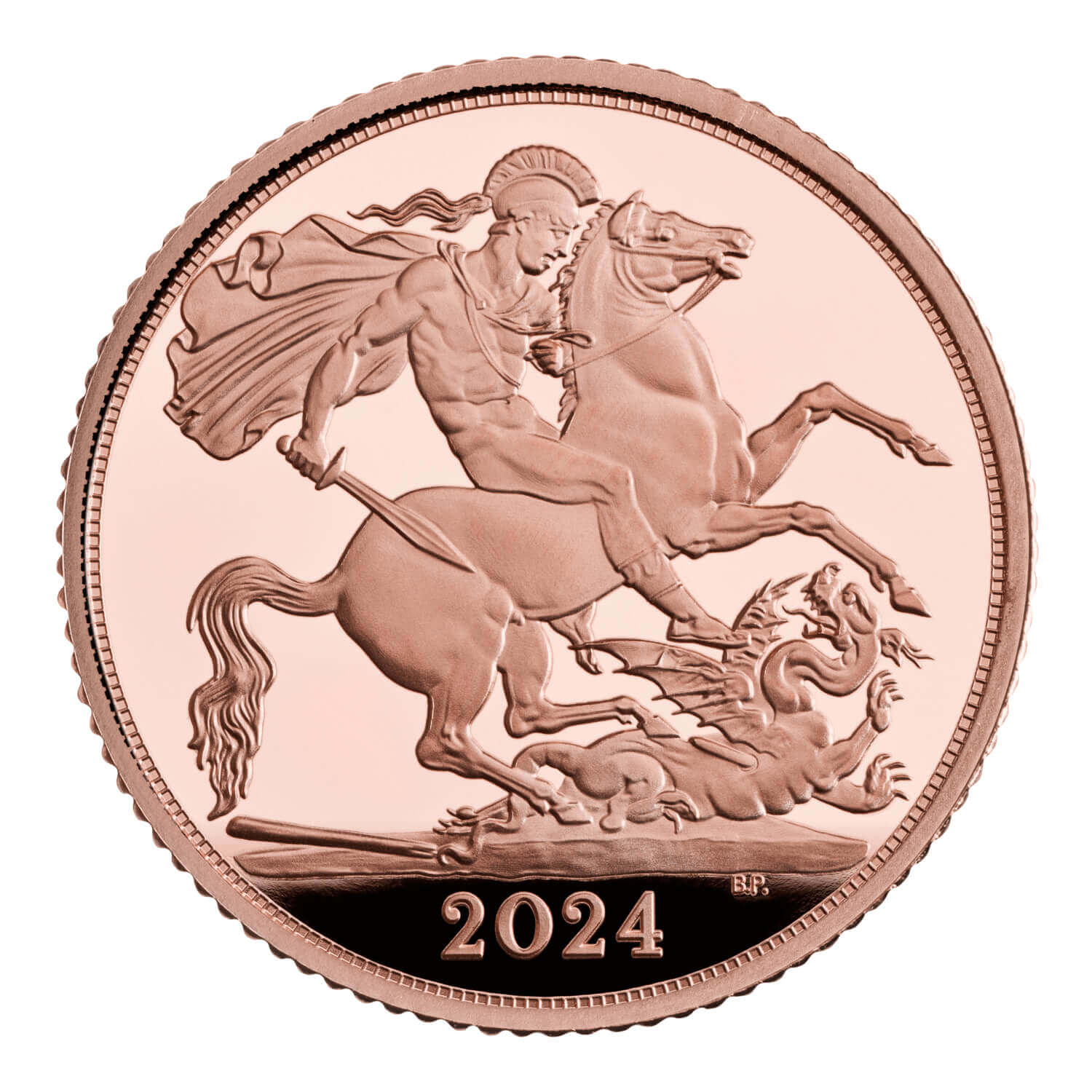 The Sovereign 2024 Three-Coin Gold Proof Set includes The Sovereign, Half-Sovereign and Quarter-Sovereign. Each coin in the set has been struck in 22 carat gold to Proof standard. The 2024 Sovereign Collection marks the first time Benedetto Pistrucci’s St George and the dragon design and the first definitive coinage portrait of His Majesty King Charles III have appeared together on a Proof Sovereign. The obverse of each coin in the collection features the first definitive coinage portrait of His Majesty The King designed by Martin Jennings. This three-coin set comes with a detailed booklet on the history of The Sovereign, the life and work of Benedetto Pistrucci, and the start of a new Carolean era.