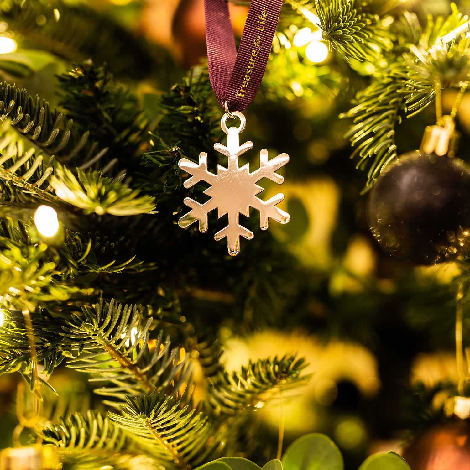 This decoration is timeless and beautiful. Handcrafted in high polished Sterling Silver and topped with The Royal Mint gold embossed purple ribbon this is the perfect accompaniment to a luxuriously dressed Christmas tree. It bears the Royal Mint Tower hallmark: a symbol of true quality. Perfect for a baby’s first Christmas, a first Christmas in a new home or to be gifted to a loved one. The decoration is presented in a velvet pouch in a gift box.
