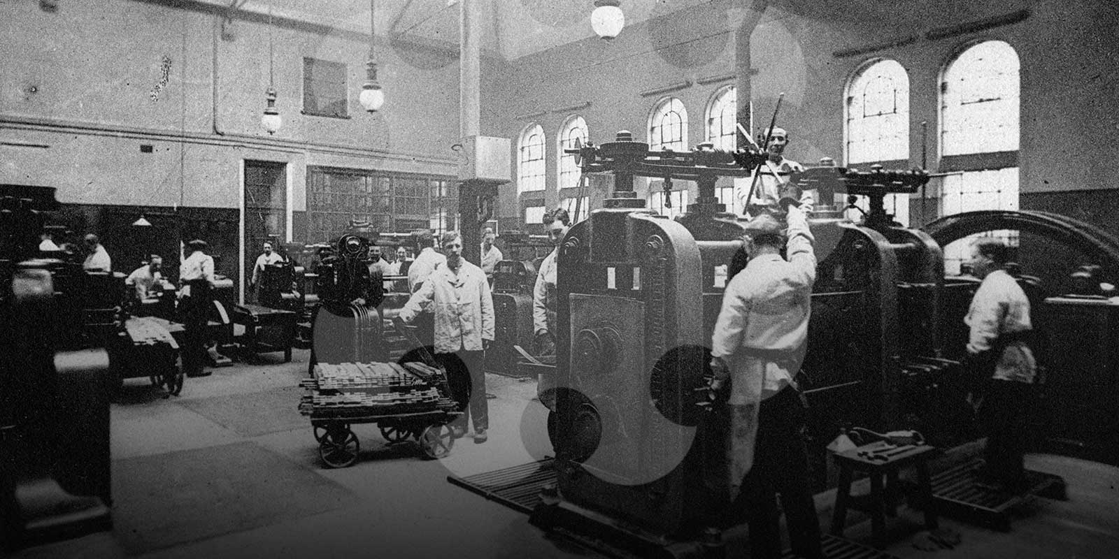 In order to expand and develop, The Royal Mint moves to a new, custom-built facility erected on Tower Hill just a few hundred yards away from the Tower of London. The new building is equipped with the latest steam-powered machinery that is arranged in a logical production sequence.