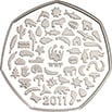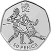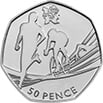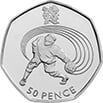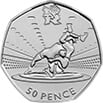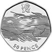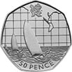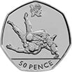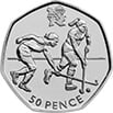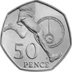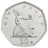 | 1982-2008 | Britannia - revised inscription A figure of Britannia, seated beside a lion, with a shield resting against her right side, holding a trident in her right hand and an olive branch in her left hand, with the figure 50 below and the inscription FIFTY PENCE above. Designed by: Christopher Ironside |