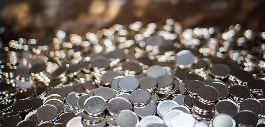 The strip is passed through powerful rolling mills that reduce it down to the thickness of a coin. Discs of metal are then punched from the strip by a blanking press. The press can make up to 10,000 discs a minute. These are called ‘blanks’.
