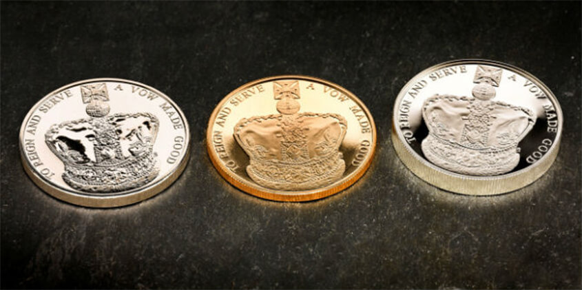 From left to right, Brilliant Uncirculated, Proof and Piedfort Proof Coronation crown. Here, as well as being able to see the enhanced level of detail and the 'frosting' you can also see that Piedfort coins are twice as thick as standard coins.