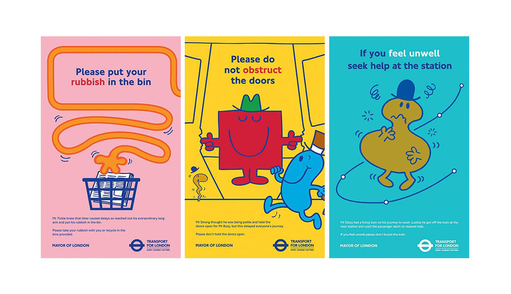 Perhaps remembering their success in Glasgow so many years earlier, the Mr. Men Little Miss characters are recruited for a series of public information posters on the London transport system. -