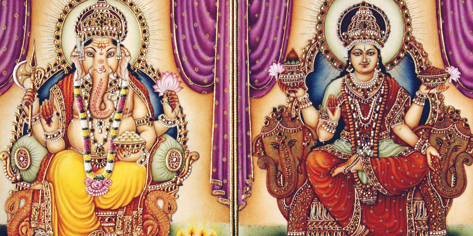 Add colours of your choice to images of the goddess Lakshmi, the god Ganesh and the symbol Om.