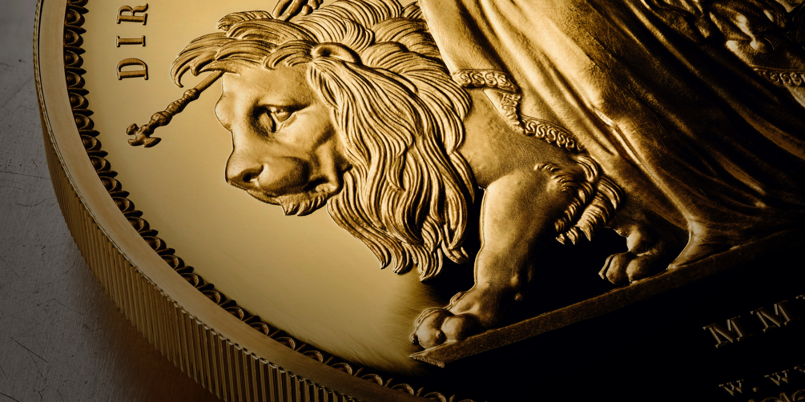 A close up image of the Lunar and the Lion gold coin from the Great Engravers highlighting the intricate design of the lions mane.