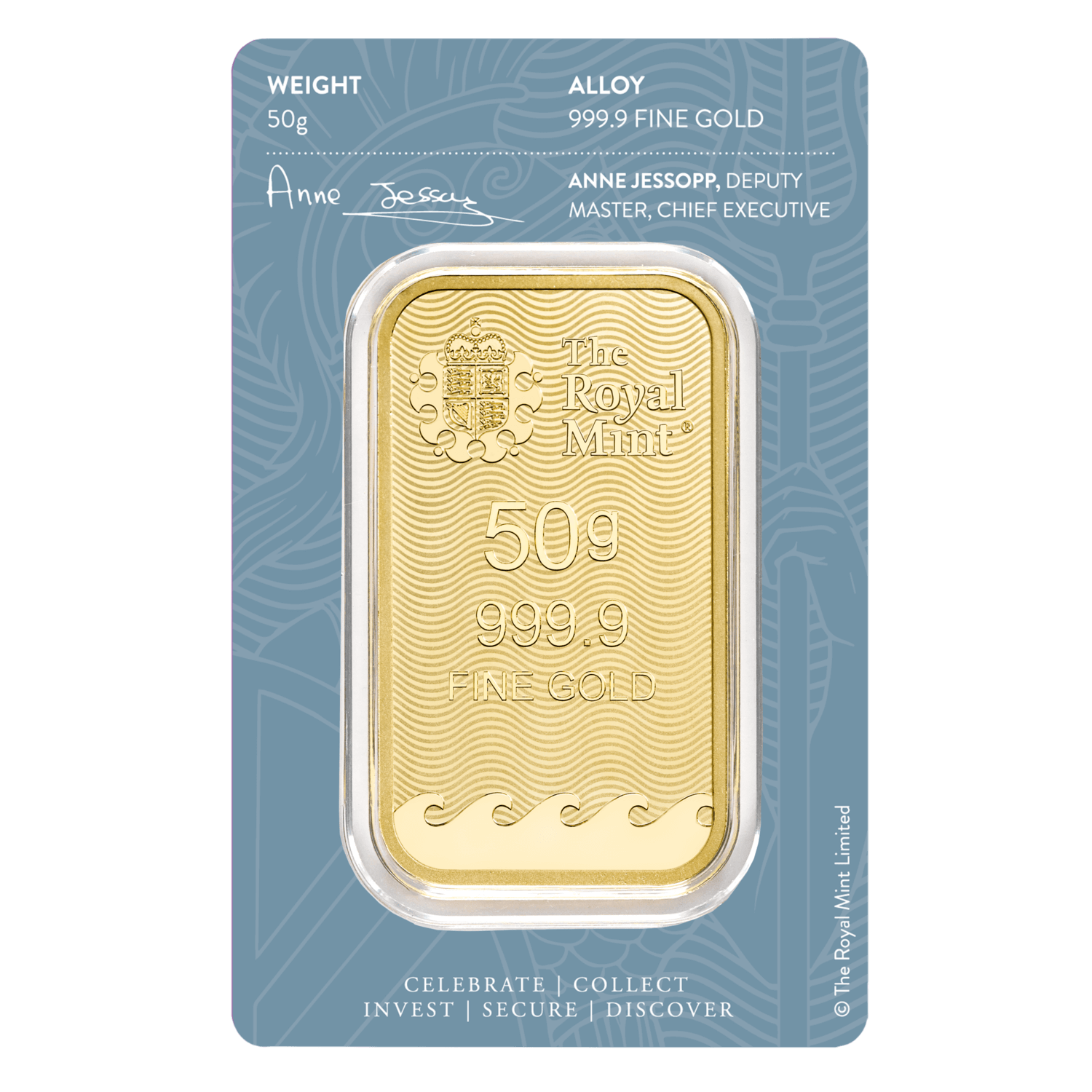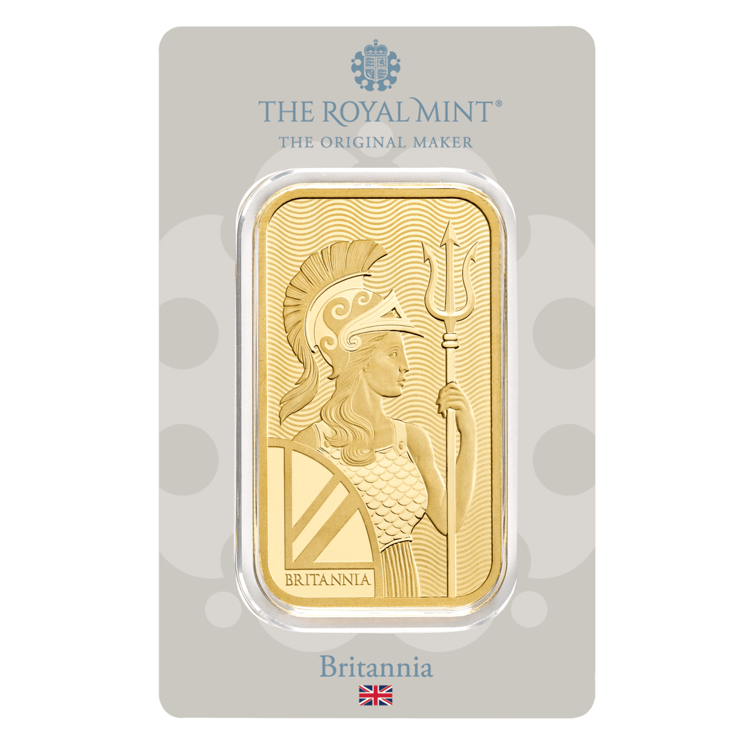 This flat-edged, 50g gold bar, struck in 999.9 fine gold, features Britannia, the iconic emblem of steadfast British spirit. The bar is imprinted with a unique serial number and comes in secure, Britannia-branded blister packaging. The design depicts Britannia clutching her trident as she gazes over the waves, protecting our shores, and serves as a fitting embodiment of the strength and security the gold bar provides bullion investors looking to expand their portfolio.