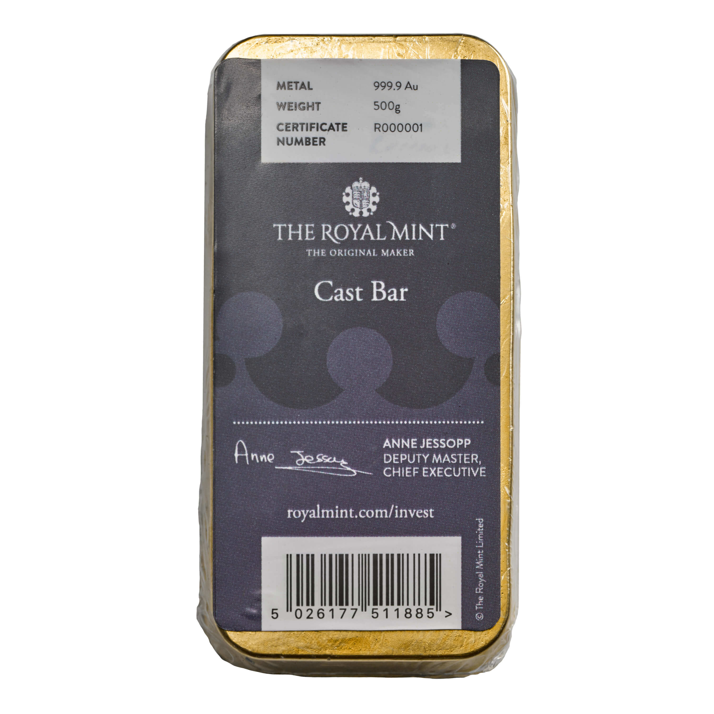 This 500g gold cast bar is produced by The Royal Mint, a name synonymous with quality and heritage. Struck in 999.9 fine gold, each bar offers the reassurance of exceptional purity and authenticity, complete with a unique serial number. Whether chosen as a portfolio cornerstone or a physical expression of long-term investment, this bar is available with free insured delivery or the peace of mind of secure storage in The Vault®—our state-of-the-art precious metal facility.