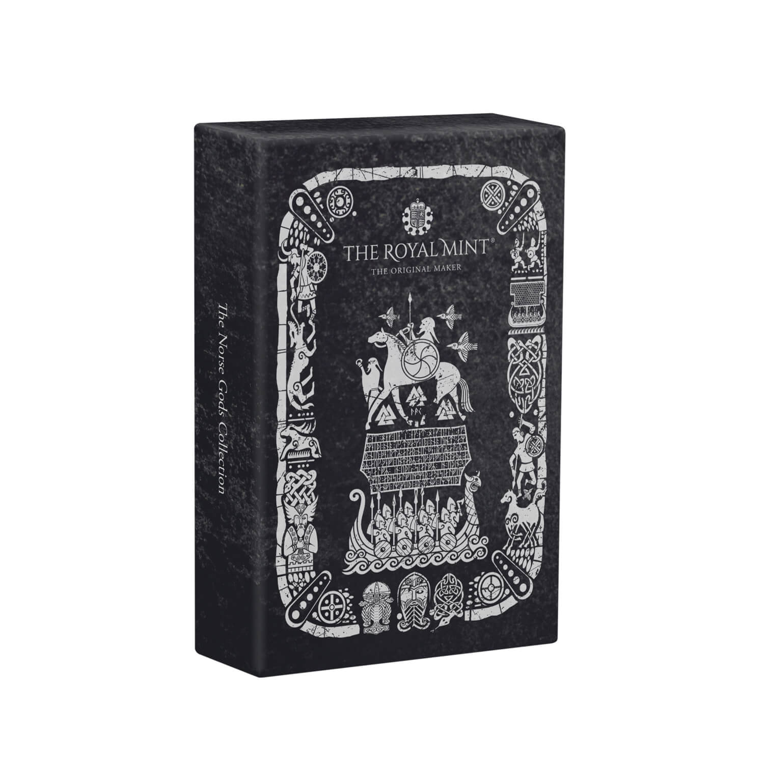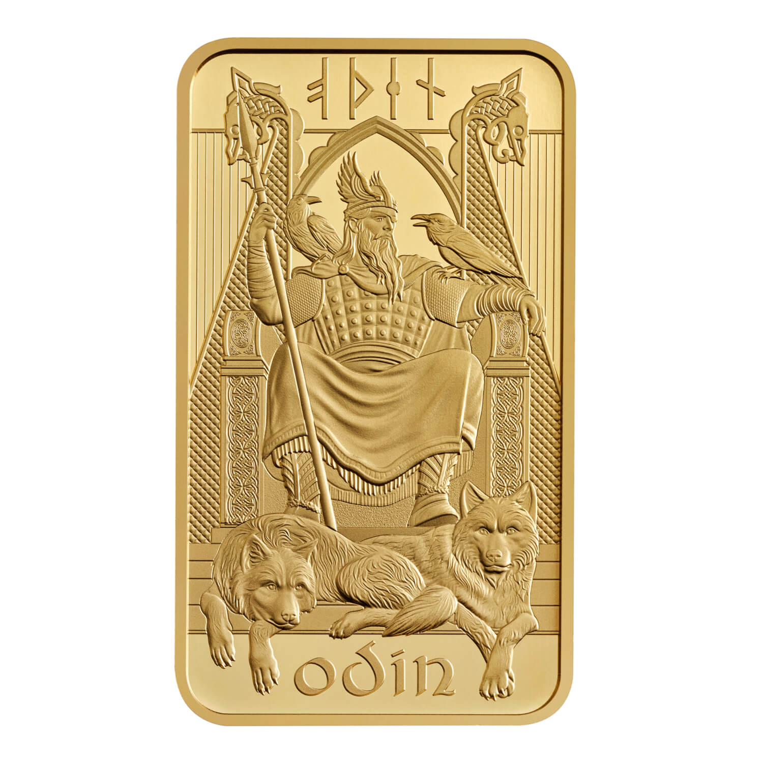 For this beautiful minted bullion bar, the All-Father majestically sits at the forefront of the design clutching his mighty spear, Gungnir. His ravens, Huginn and Muninn, sit on his shoulders and his wolves, Geri and Freki, lie at his feet.