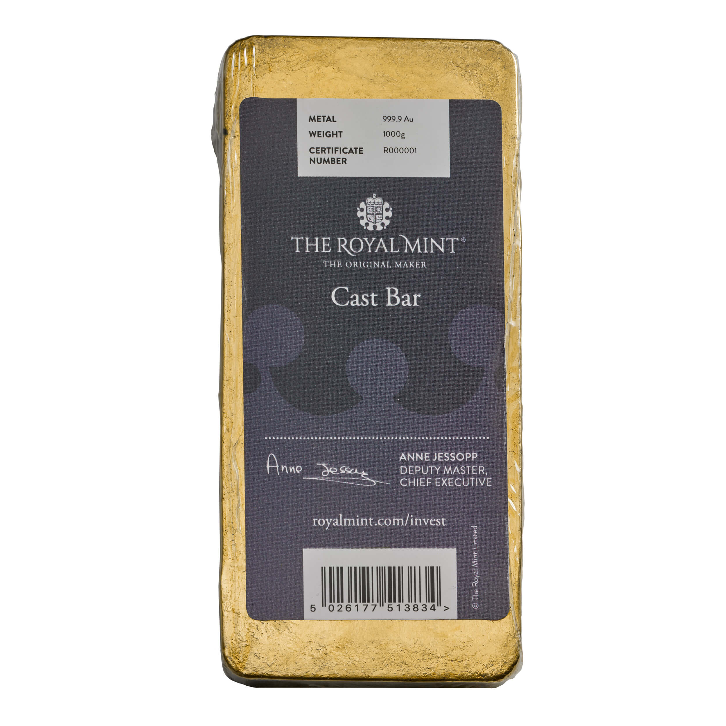 The 1kg gold cast bar from The Royal Mint contains 1 kilo (1000g) of 999.9 fine gold. It is available for free insured UK delivery or secure storage in The Vault ®, The Royal Mint’s purpose-built precious metal storage facility. Each gold bar is imprinted with a unique serial number and The Royal Mint’s logo. All of our gold bars are VAT-free for non VAT registered private individuals.