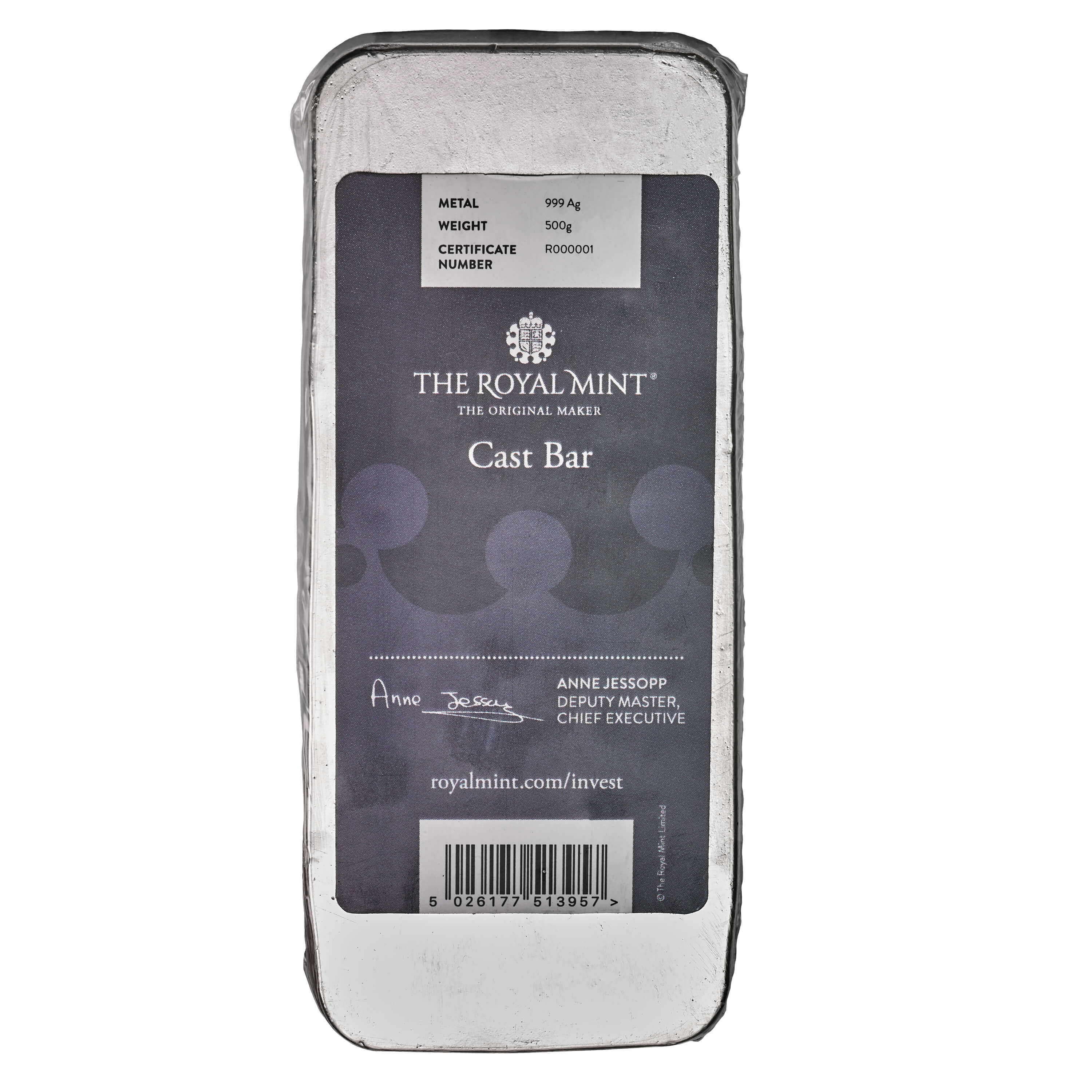 The 500g silver cast bar from The Royal Mint contains 500g of 999 fine silver. It is available for free insured UK delivery or secure storage in The Vault ®, The Royal Mint’s purpose-built precious metal storage facility. Each silver bar is imprinted with a unique serial number and The Royal Mint’s logo.