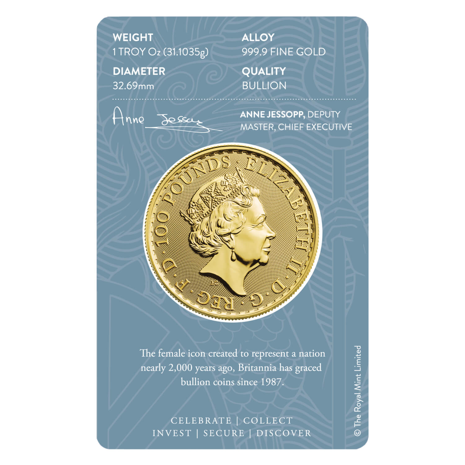 The 2021 Bullion Britannia Gold 1oz Coin redefines security in the bullion market. Created by the team behind the United Kingdom’s new-style £1 coin (dubbed the ‘world’s most secure coin’), Britannia has evolved once more to spearhead the best security technology available and lead the way as the most visually secure coin in the world. Philip Nathan’s award-winning Britannia from 1987 is the enduring symbol of a nation, boldly standing beside a shield that bears the Union Flag, a symbol of Britain’s strength, and holds an olive branch representing peace. Nathan’s Britannia is as beautiful as ever, struck in 999.9 fine gold, now enhanced with four landmark features. In the lower left-hand of the design, below Britannia’s flowing gown, is a trident to represent her naval history. As the viewer changes their perspective this trident becomes a padlock, emphasising the coin’s secure nature. Surface animation reflects the movement of waves, and fine details like the Union Flag on Britannia’s shield have been carefully highlighted in the coin’s bullion finish. These added security features both decorate and protect the coin, just as the micro-text that borders the design states – DECUS ET TUTAMEN, or AN ORNAMENT AND A SAFEGUARD. Securely packaged in Britannia-branded blister packaging for safe transportation and storage. A clear, removable film is included on the packaging to protect the blister while in transit. It can be removed once the product has been received, without affecting the original value.