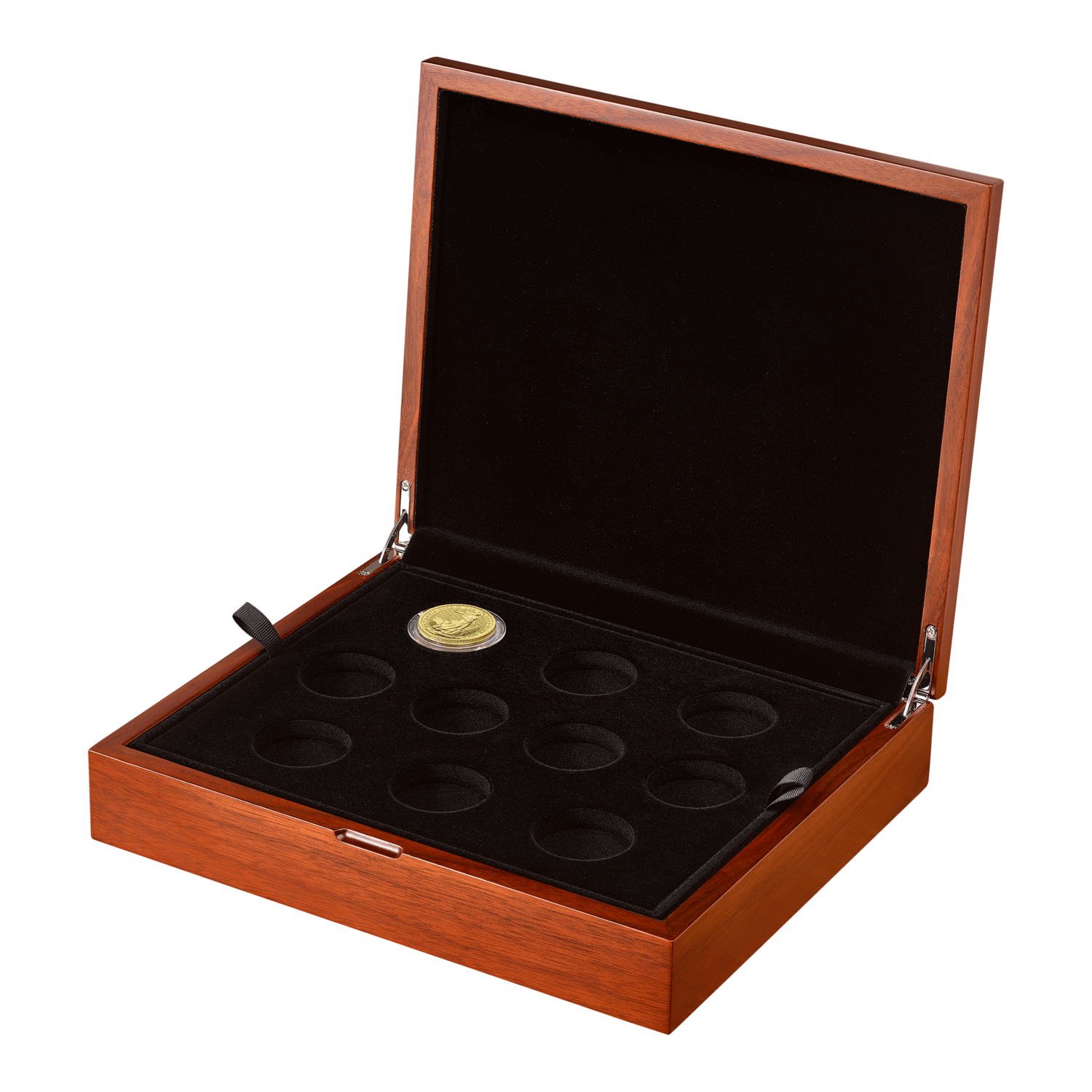 - Accompanied by a stylish, wooden presentation case that contains one coin