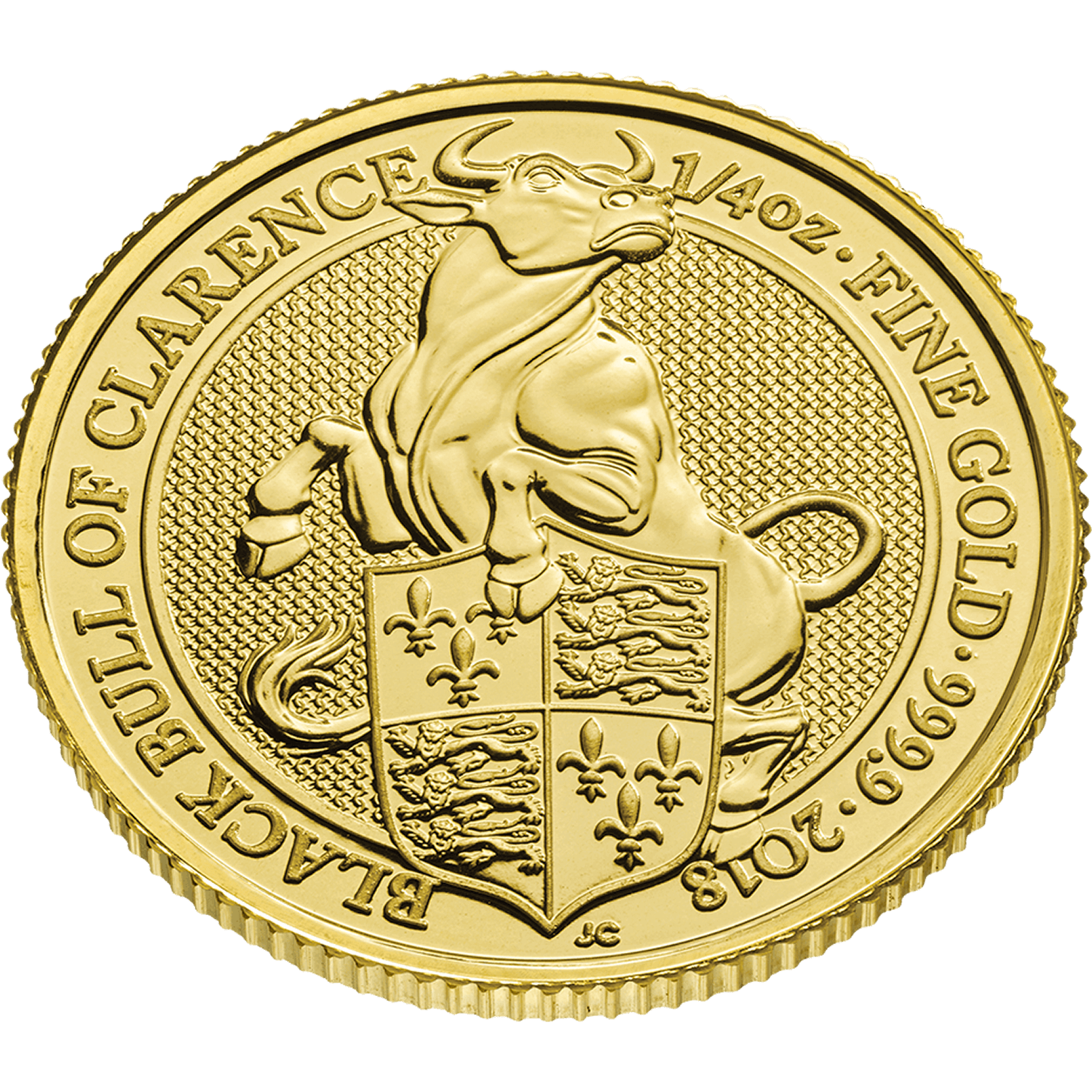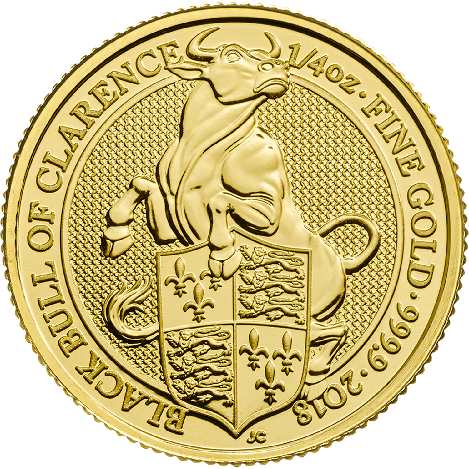 Following the success of the Lion of England, the Griffin of Edward III, the Dragon of Wales and the Unicorn of Scotland, The Black Bull of Clarence Quarter-Ounce Fine Gold Bullion Coin, features an original design by acclaimed coin designer Jody Clark.
