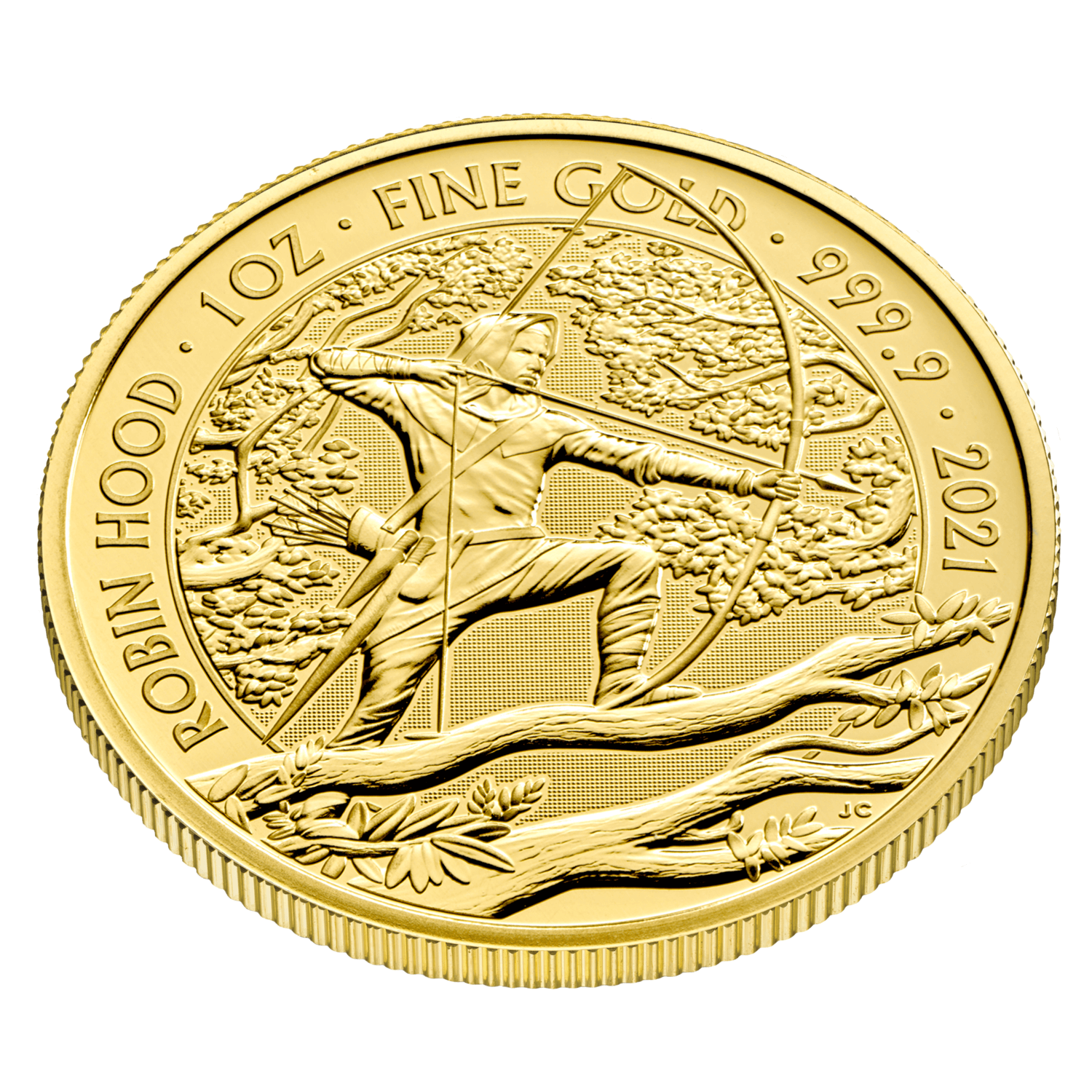 Robin Hood has been depicted in a design by Jody Clark with a bow in hand, ready to spring into action in Sherwood Forest. He is accompanied by a portrait of Her Majesty The Queen on the coin’s obverse, which was also designed by Jody Clark. Struck in 999.9 fine gold, each one ounce coin is finished to The Royal Mint’s bullion standard, and is also available as a one ounce silver edition.