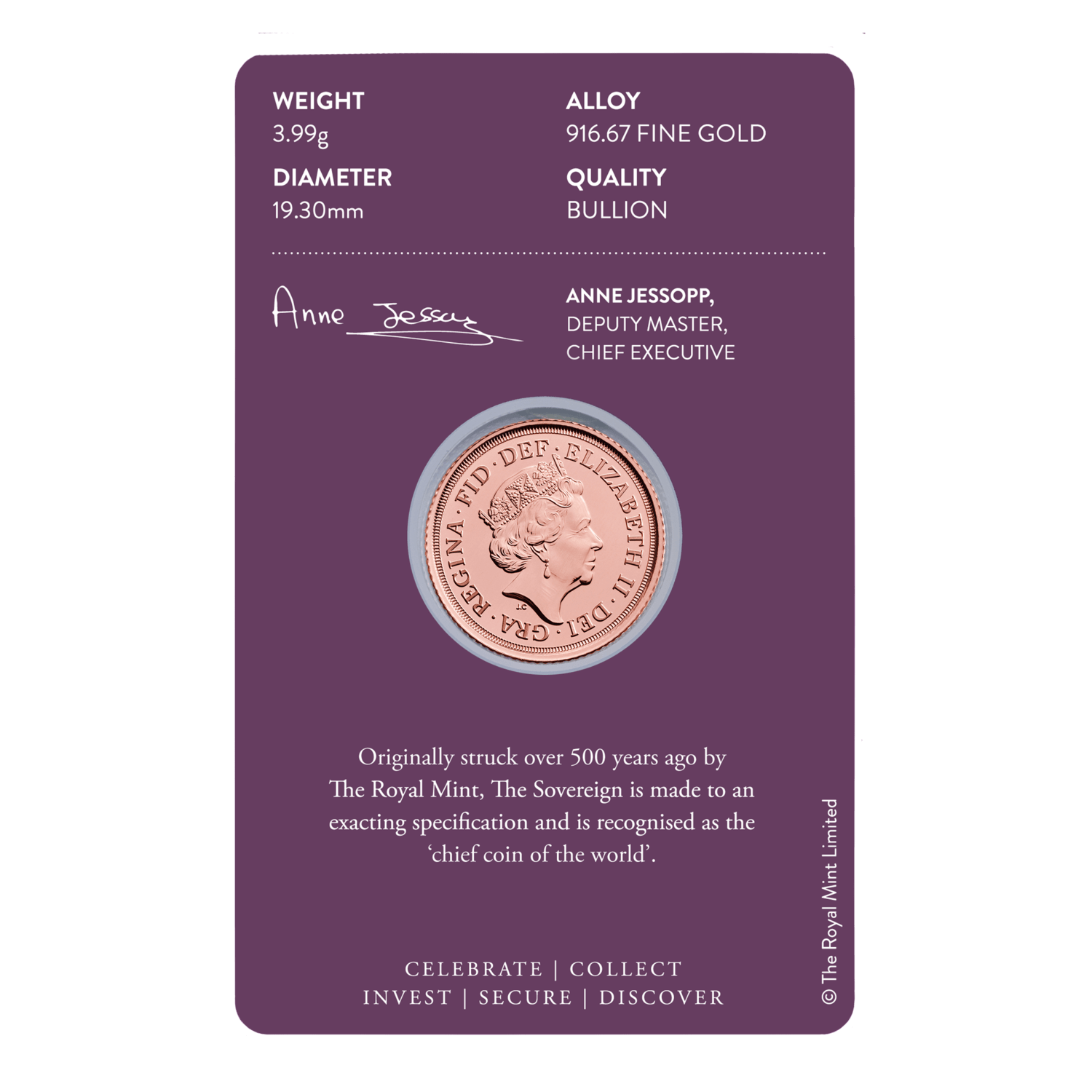 - The weight and purity of each Sovereign coin is assured by Royal Proclamation