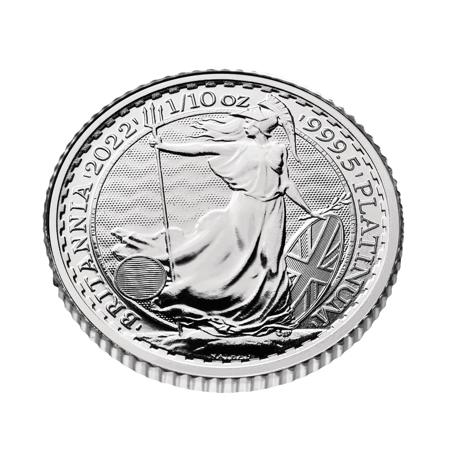 The Britannia 2022 1/10oz platinum bullion coin is available to purchase individually or in tubes containing twenty-five coins.