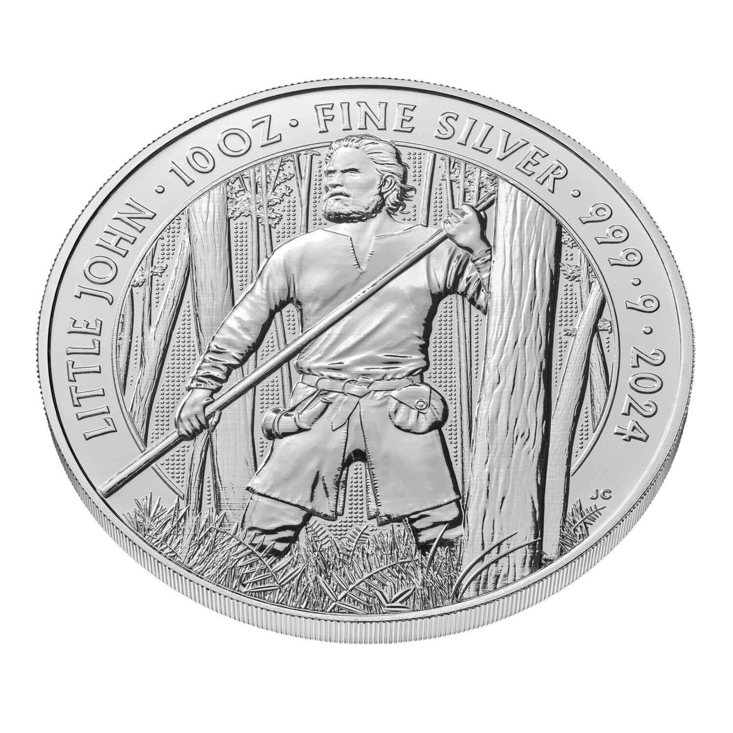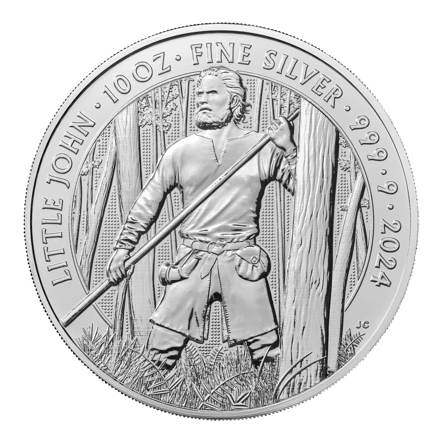 Little John takes centre stage in Jody Clark’s reverse design for the coin, standing tall and proud amongst the trees of Sherwood Forest. Struck in ten ounces of 999.9 fine silver, the 2024-dated coin also features the official coinage portrait of His Majesty King Charles III on its obverse and is finished to The Royal Mint’s bullion standard
