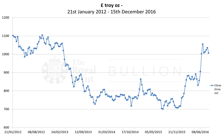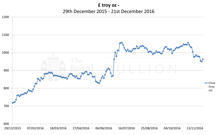 On the whole, 2016 was a volatile year for gold, with significant increases and falls around certain key events and an increase from a low of just £716 to a high of over £1055. The most notable increase in sterling terms was of course following the Brexit referendum in June / July, where key analysts and market commentators correctly predicted substantial price rises if Britain did vote to leave the EU. Although this is the case, as political commentators were predicting a ‘remain’ vote on the run up to ballot day, the shock of the outcome can clearly be seen in the graph as a sharp increase as the votes were counted. With this said, although the US election results were perhaps just as unexpected, the steady decrease in price is perhaps more interesting, as prior to the US election taking place, commentators were also predicting a ‘Brexit-style’ price increase if Trump was elected. This, of course, wasn’t the case, and gold market sentiment following the result showed more of a general decline.