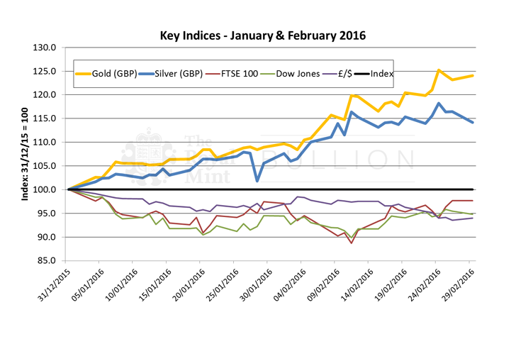 This rally in gold demand and increase in price continued into February where we reported that gold prices rose by over 24% in early 2016, also prompted by falls in oil prices and safe haven trading. As shown below, between the end of 2015 and the end of February, the gold price rose by over 24% and the silver price rose by over 14%. Meanwhile, equity values fell by 2.3% (FTSE100) and 5.2% (Dow Jones Industrial Average), and the Pound lost 6% of its value against the US Dollar.