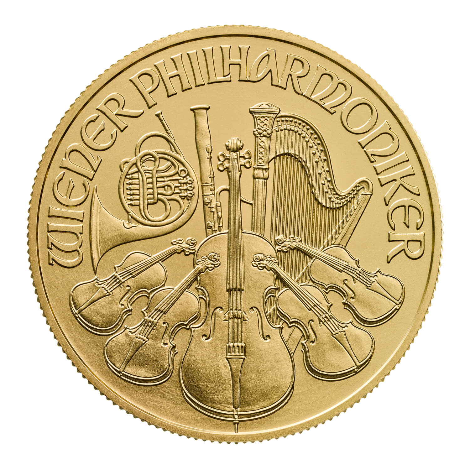 The obverse of the 1oz gold coin shows the pipe organ in the Vienna Musikverein’s Golden Hall. Whilst, the reverse of the coin depicts various instruments of the Vienna Philharmonic orchestra, including the Vienna horn, bassoon, harp, and four violins centred on a cello.