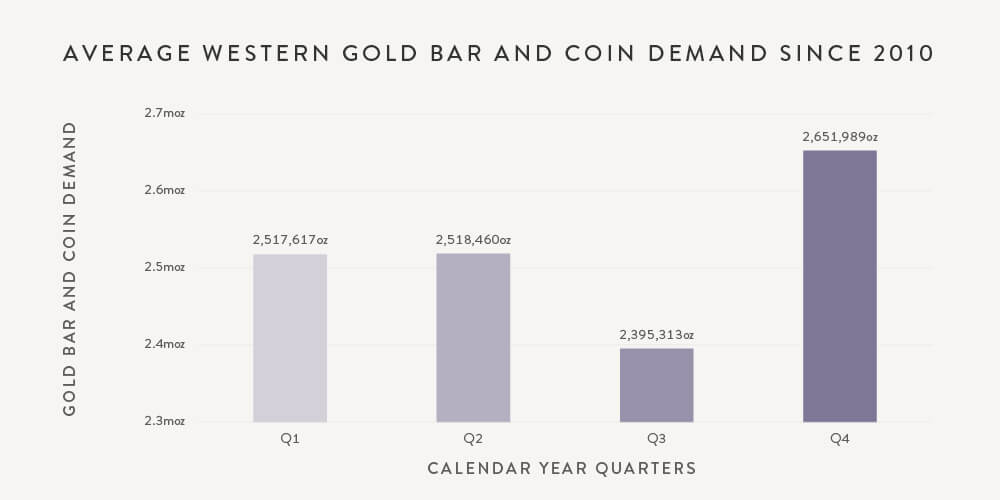 According to the recent report published by World Gold Council, since 2010, demand for bars and coins in Europe, the USA and Canada has, on average, been significantly lower in the quarter between July and September than in any other quarter.