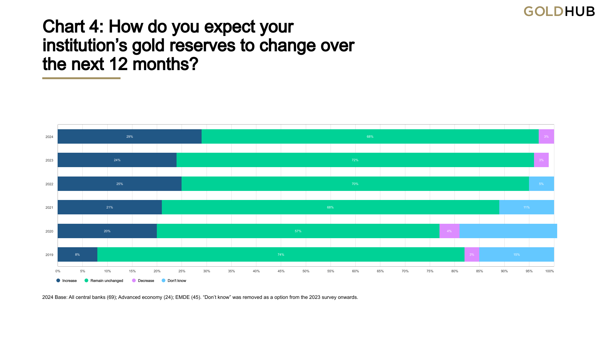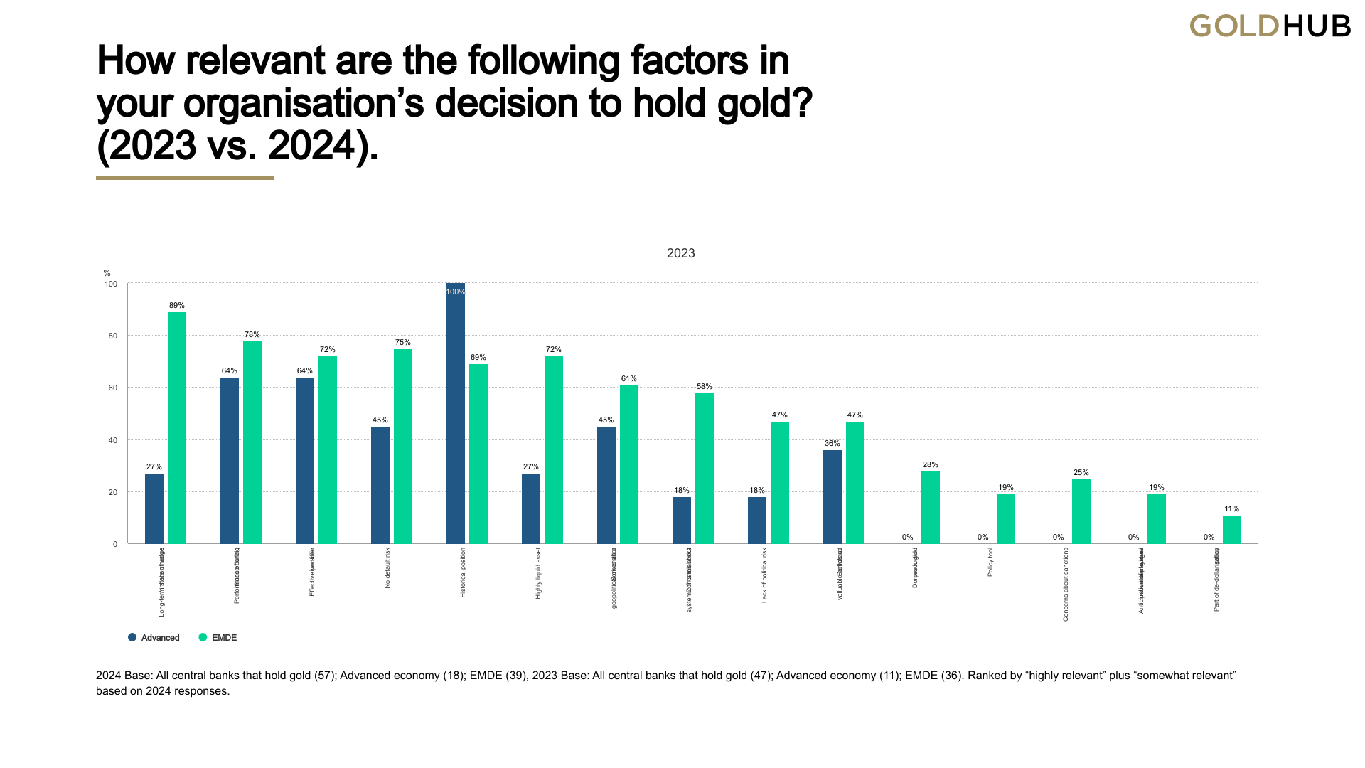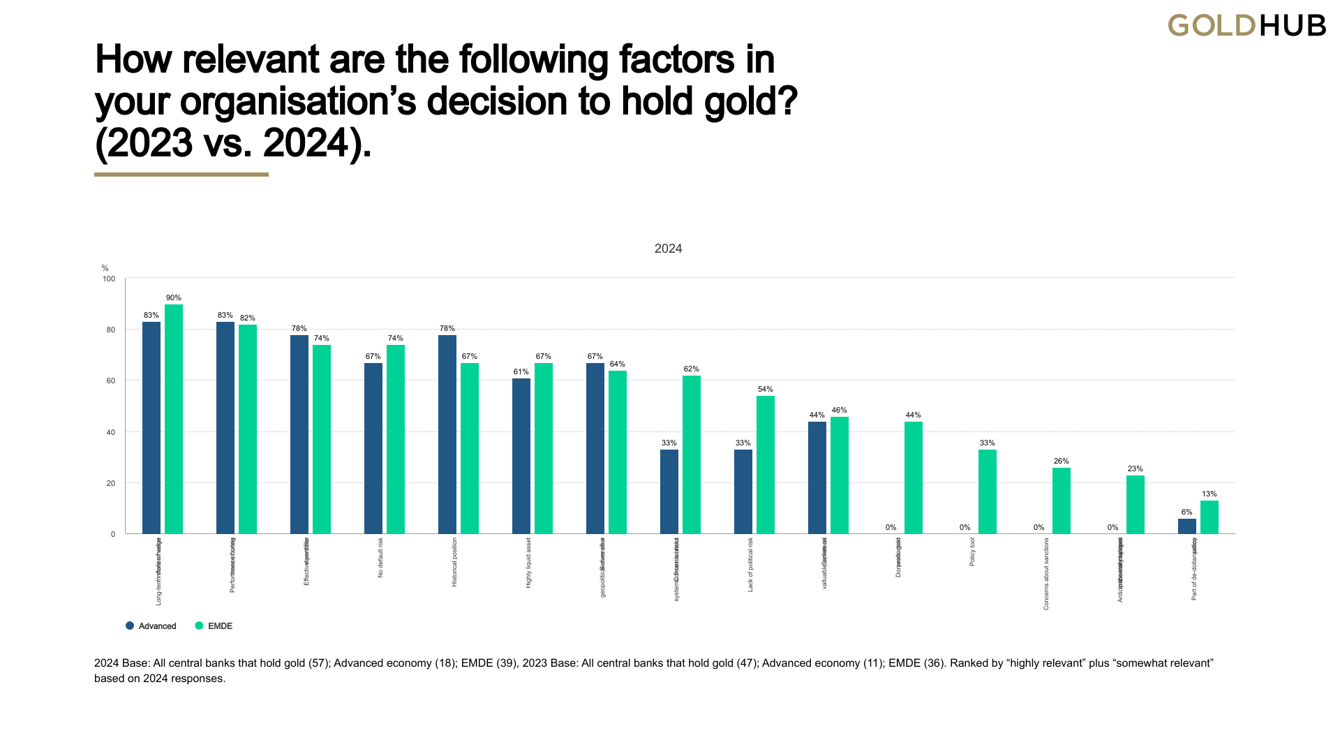 Following these record numbers, gold continues to be viewed favourably by central banks as a reserve asset. According to the 2024 Central Bank Gold Reserves (CBGR) survey, which was conducted between 19 February and 30 April 2024 with a total of 70 responses, 29% of central banks respondents intend to increase their gold reserves in the next twelve months, the highest level observed since the survey began in 2018. The planned purchases are chiefly motivated by a desire to resemble a more preferred strategic level of gold holdings, domestic gold production, and financial market concerns including higher crisis risks and rising inflation.
