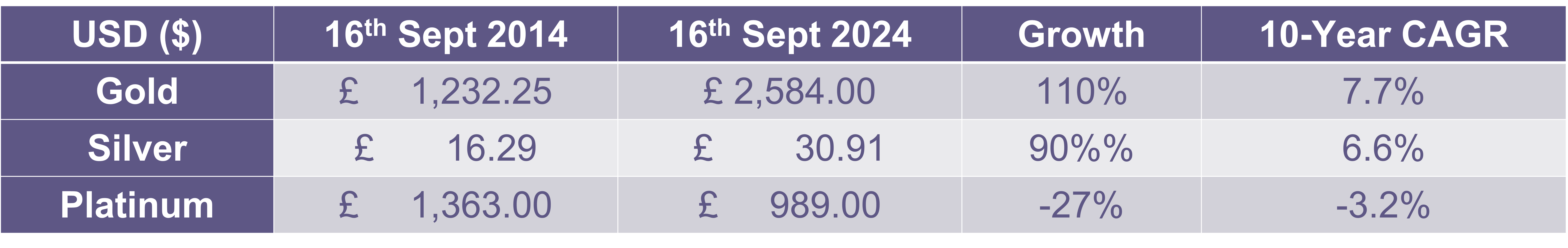 The tables below show how precious metals prices have changed in the past 10 years.