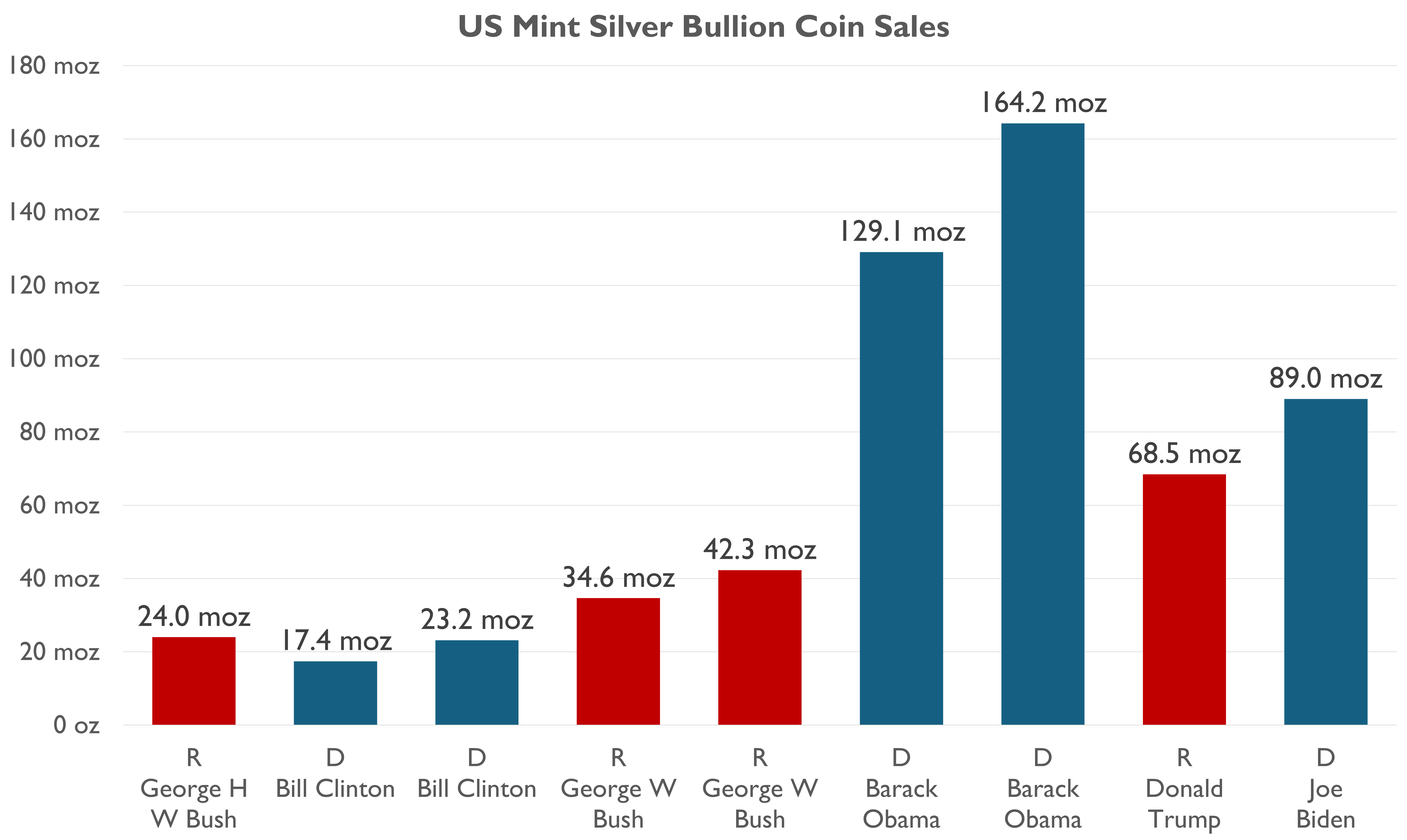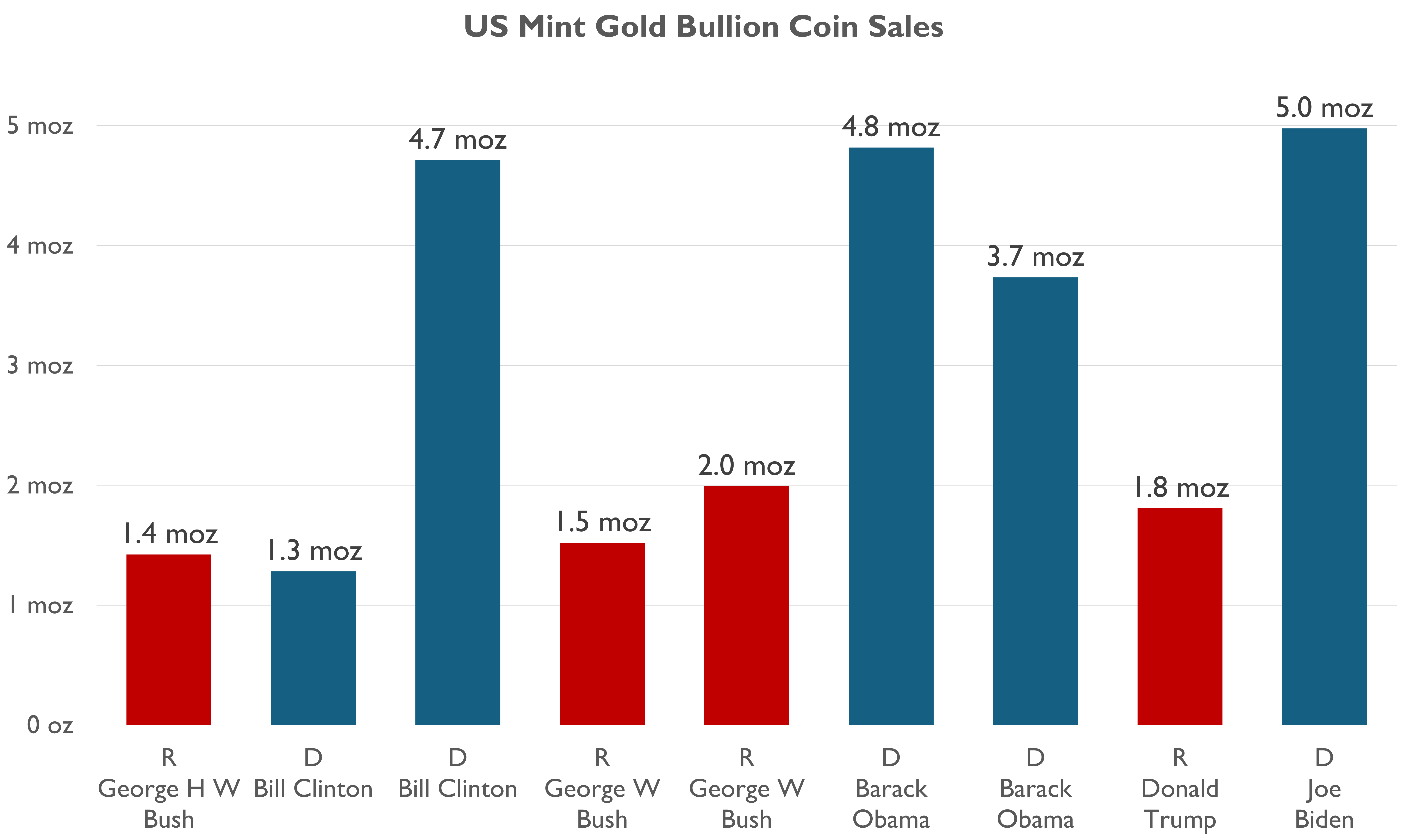 Clearly, demand for both gold and silver bullion coins has historically been higher under Democrat presidents than under Republican presidents.