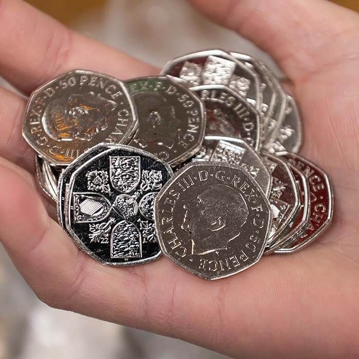 His Majesty King Charles III. The portrait appears on £5 and 50p coins.