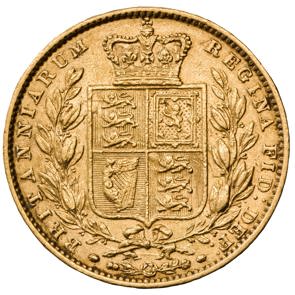 William Wyon also created the Gothic effigy that appeared on the silver crown from 1847. This extraordinary portrait shows Victoria wearing an ornate crown that cuts through a border of trefoil which arcs around the coin’s inner edge. She wears a dress embroidered with roses representing England, thistles for Scotland and shamrocks for Ireland. This portrait was the first since the reign of Charles II that a monarch wore a crown on British coinage.