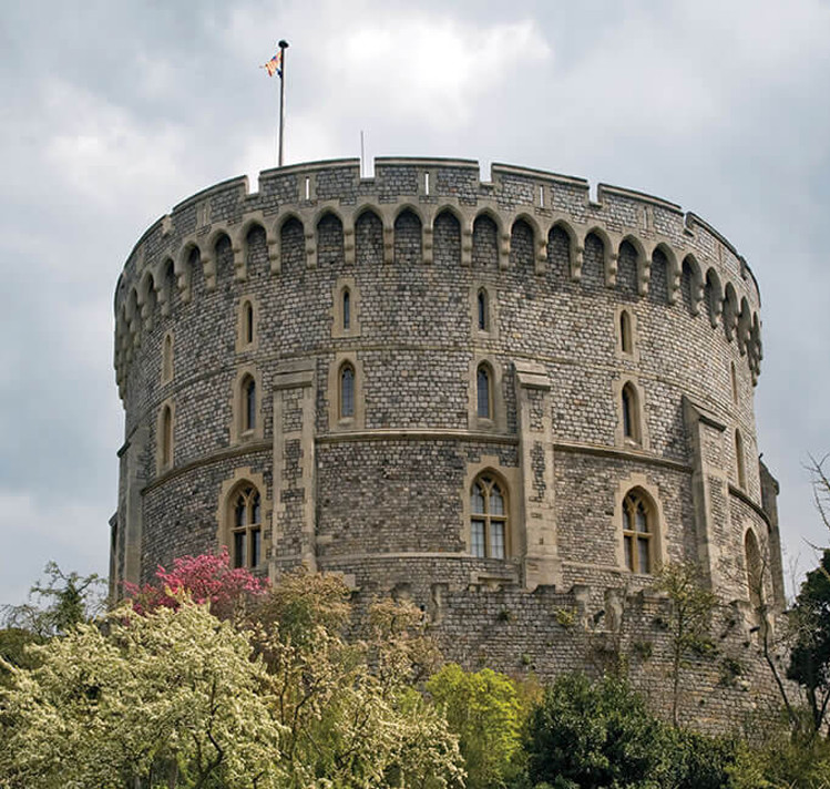 "The Royal Badge of the House of Windsor was approved by George VI in 1938. It was the king's suggestion to include the Round Tower of Windsor Castle, flying the Royal Standard (flown when the sovereign is in residence). He particularly wanted the flag to look as if it was being blown out in the wind.