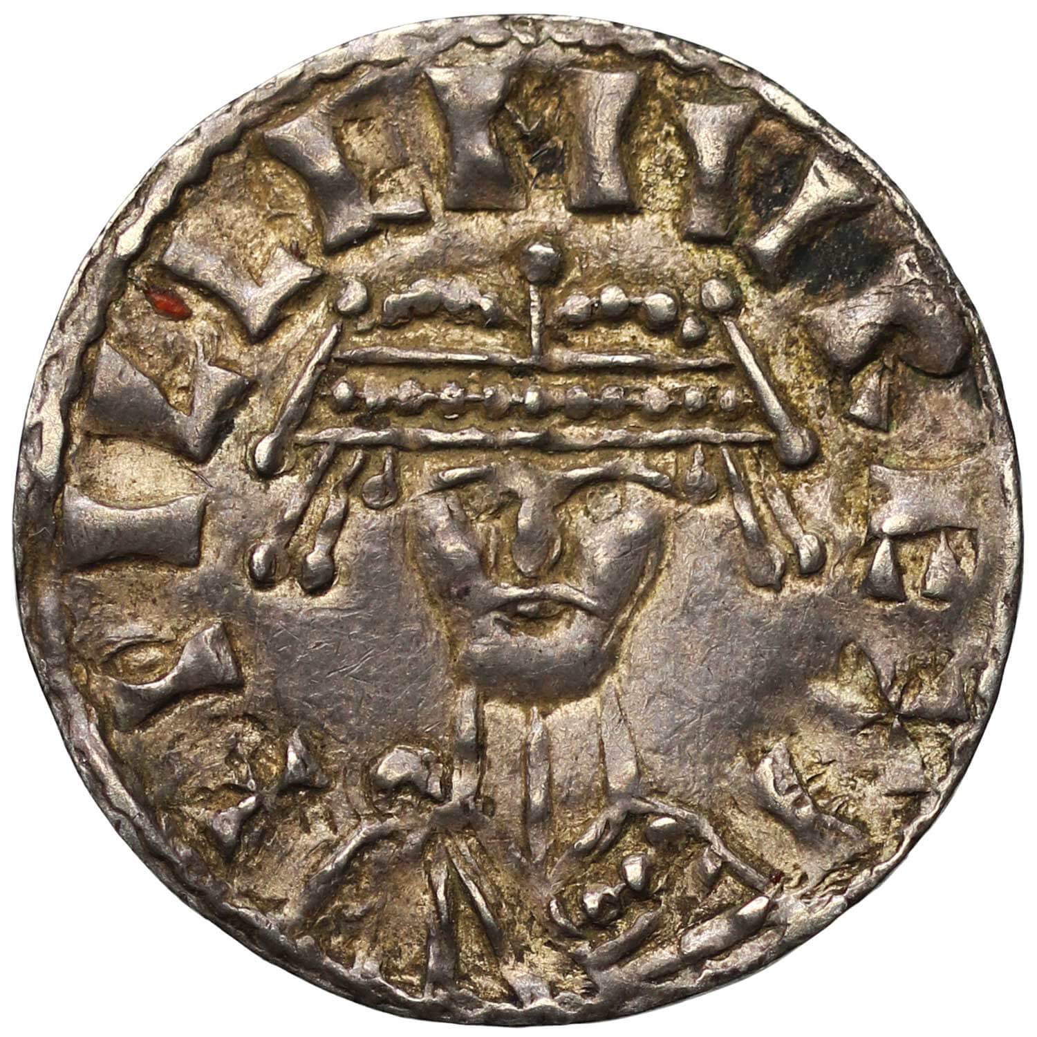 Reverse - Pellet in annulet at centre of voided cross, terminals of pellet with crescent each sides, pellet topped piles in angle, legend and beaded border surrounding, , +ÆGELRIC ON LVN