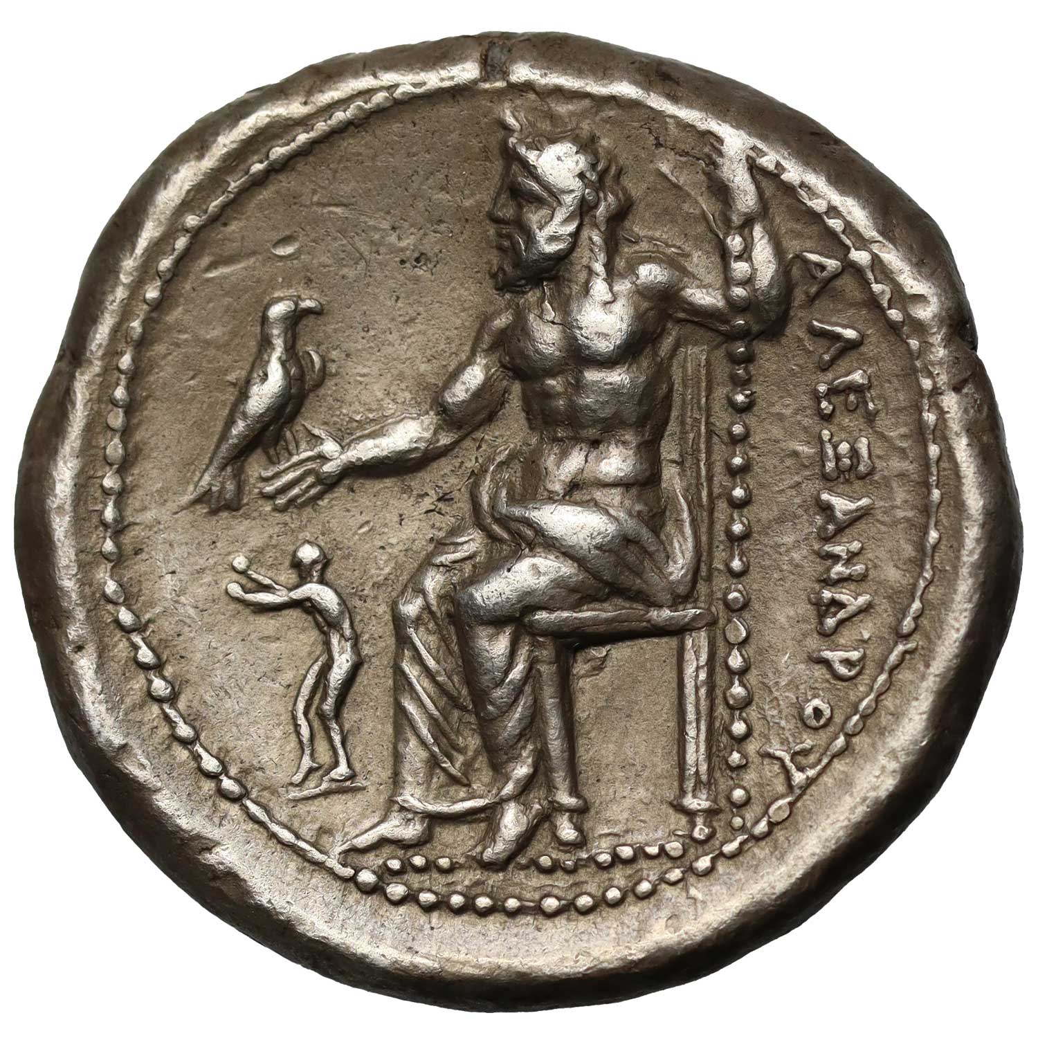 (Macedon, Alexander the Great (336-323 BC), silver Tetradrachm, lifetime issue, Aegeae (?), c. 332-323 BC, head of Herakles wearing lion skin headdress right, rev. ΑΛΕΞΑΝΔΡΟΥ, Zeus seated to left, holding eagle and sceptre, figure, boxer, in field, 17.11g, 5h (Price 187; Noe, Sicyon 3). Rare, about extremely fine.)