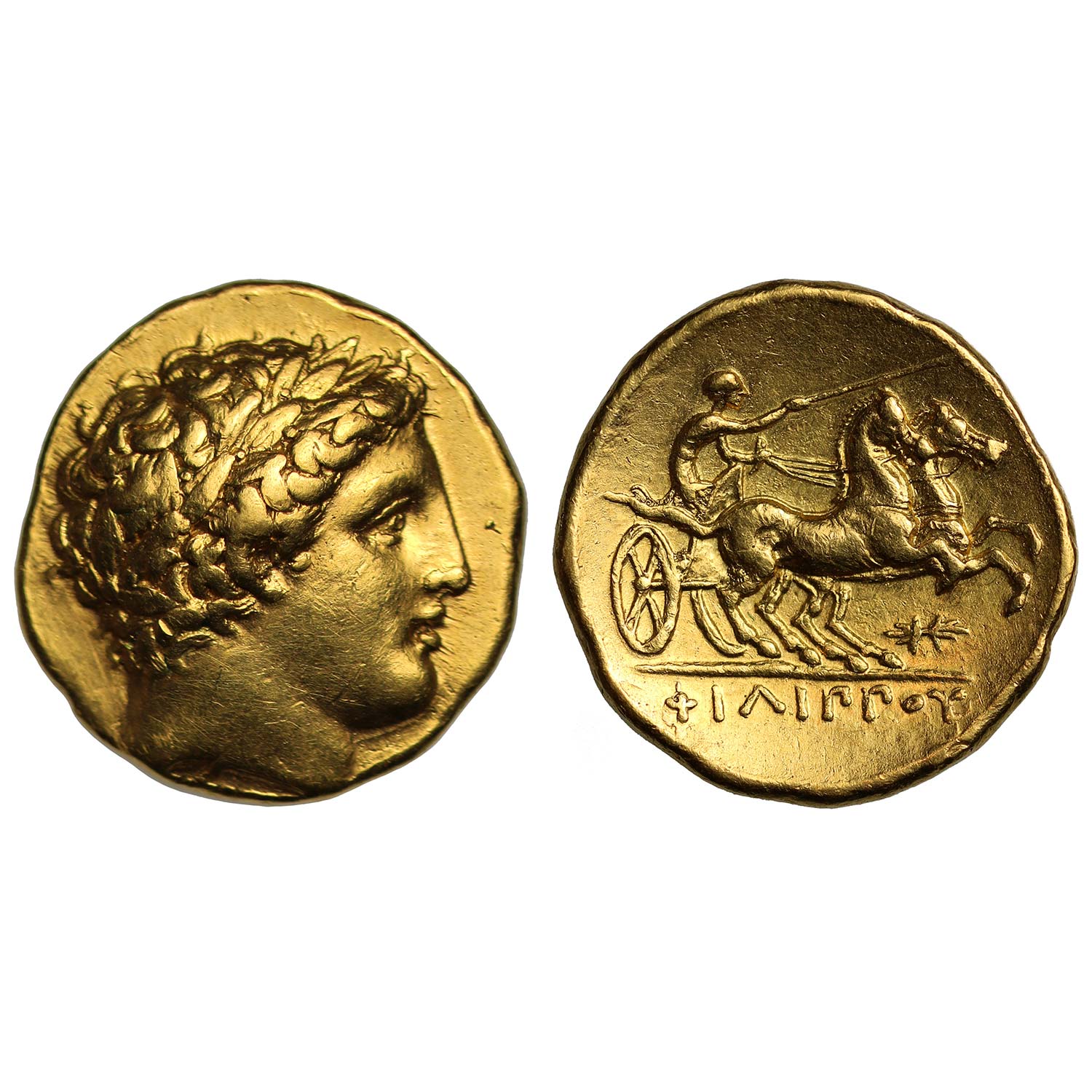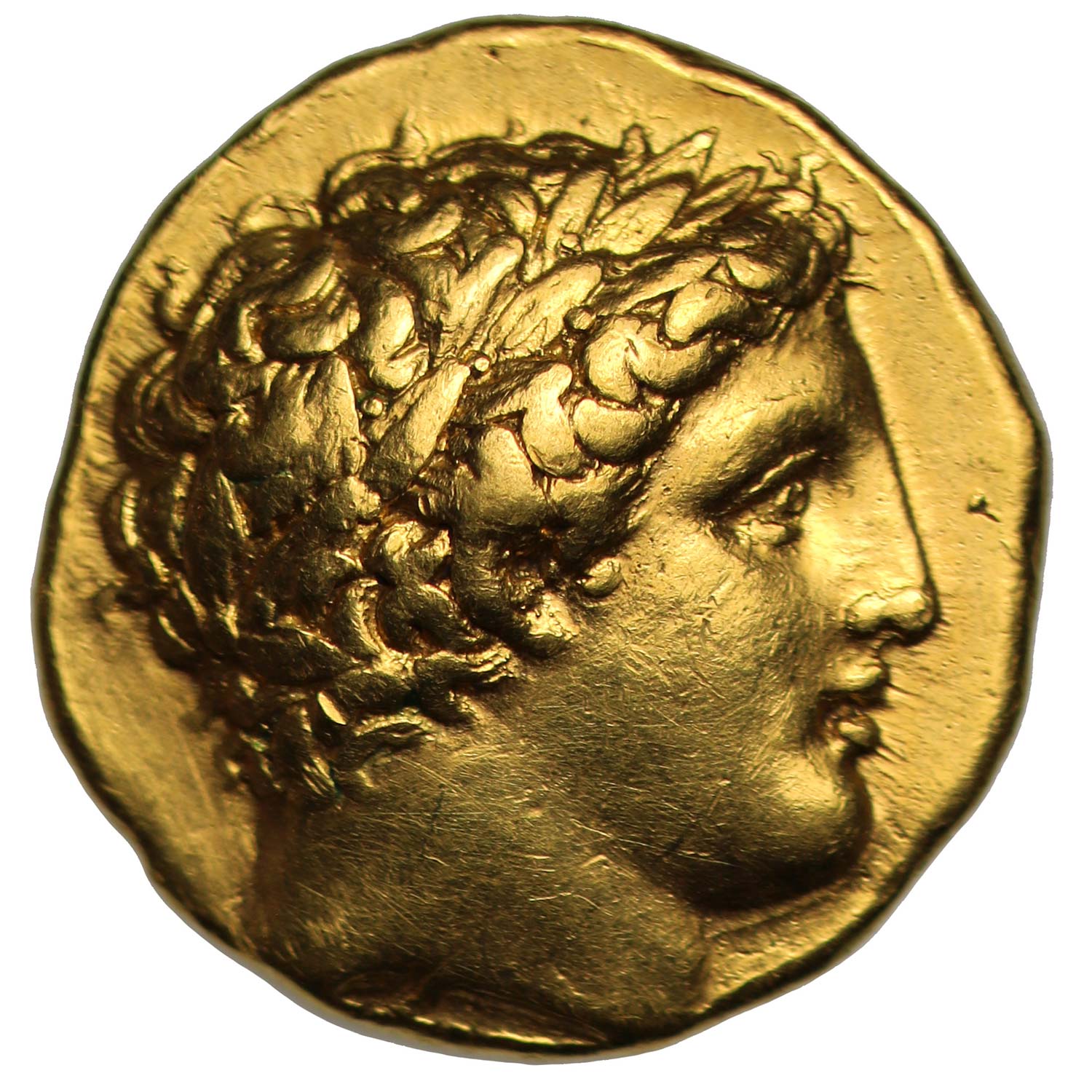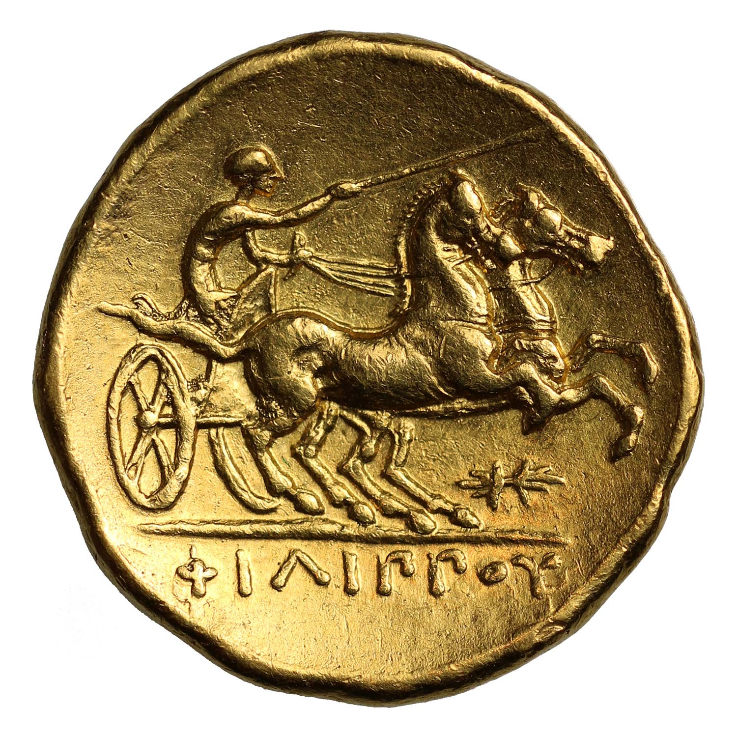 From the Kingdom of Macedon this Gold Stater was stuck during the reign of Philip II. On the obverse is the head of Apollo and on the reverse is a charioteer with galloping horses with a thunderbolt beneath them. This coin was struck around 340-328 B.C. and is in Very Fine condition.