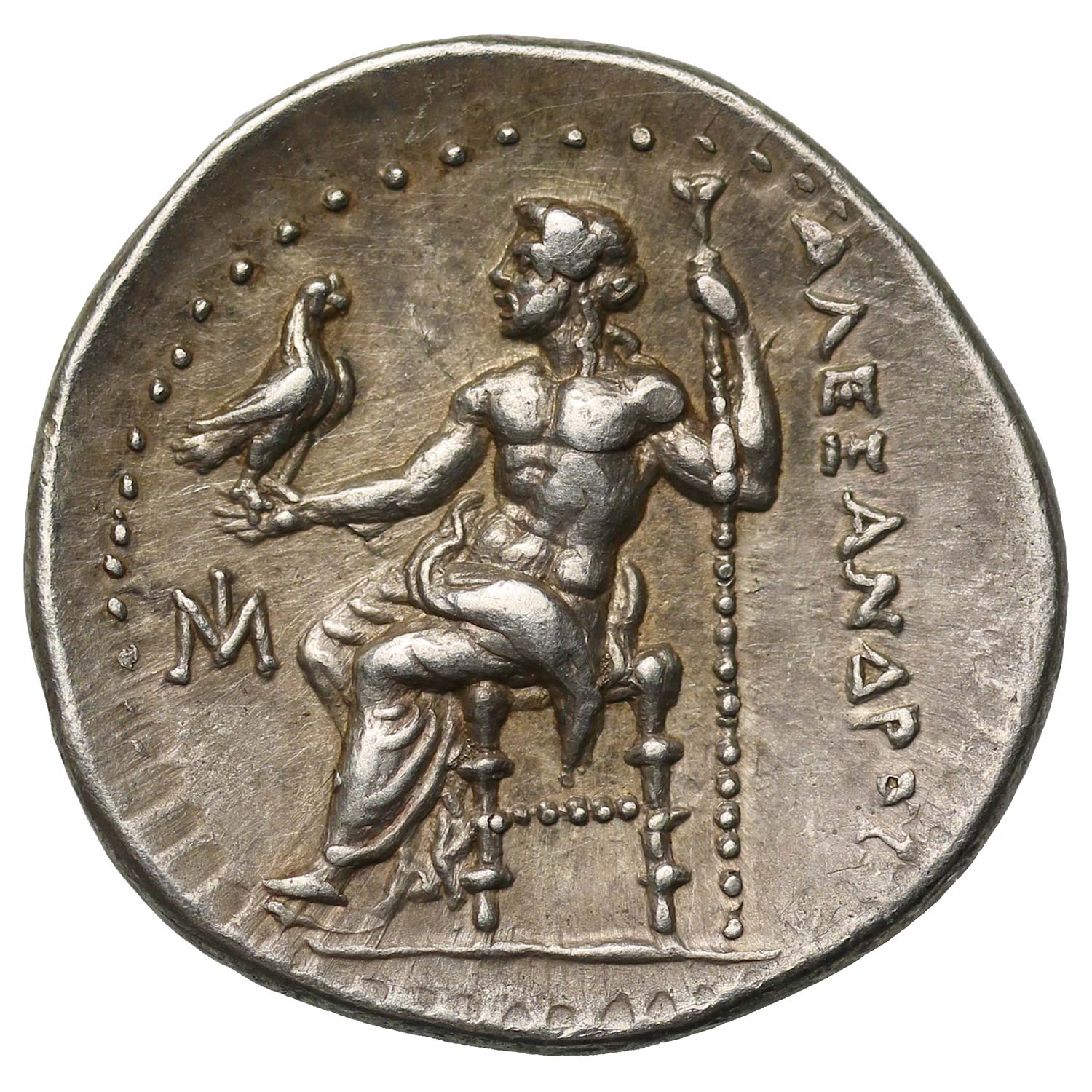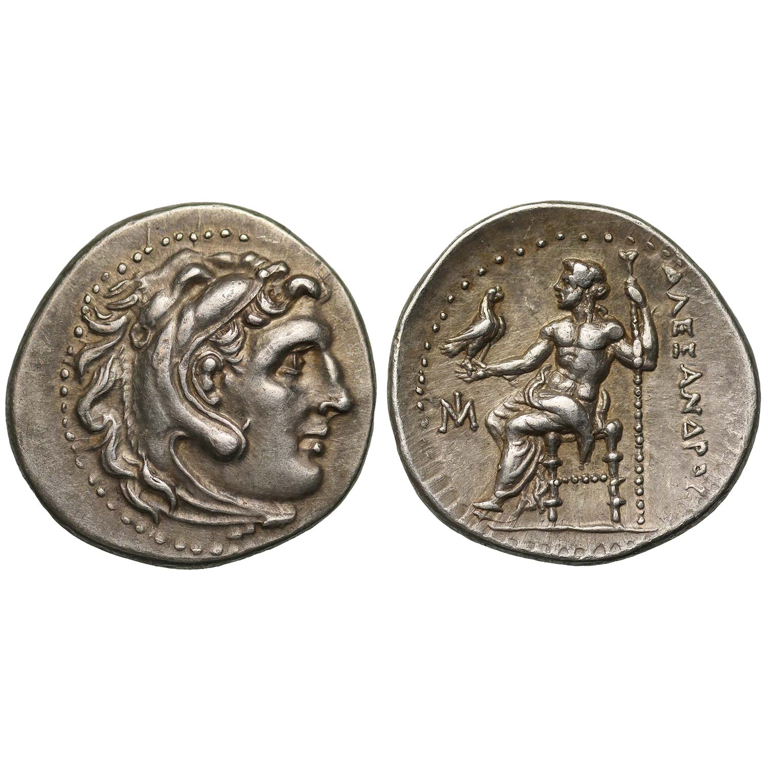 From the kingdom of Macedon this Alexander The Great Silver Drachm was struck around 295-275 BC. It depicts the head of young Herakles facing to the right wearing a lion's skin headdress on the obverse. On the reverse is Zeus seated and holding an eagle and a sceptre. This coin has attractive toning and is in minimum very fine condition.