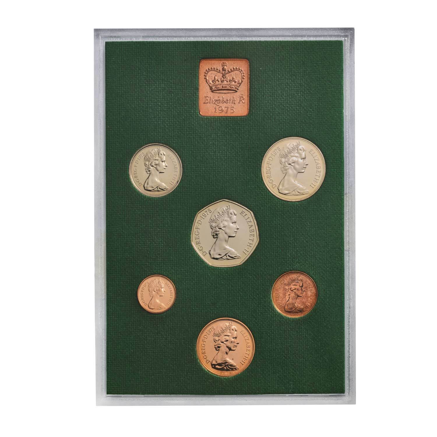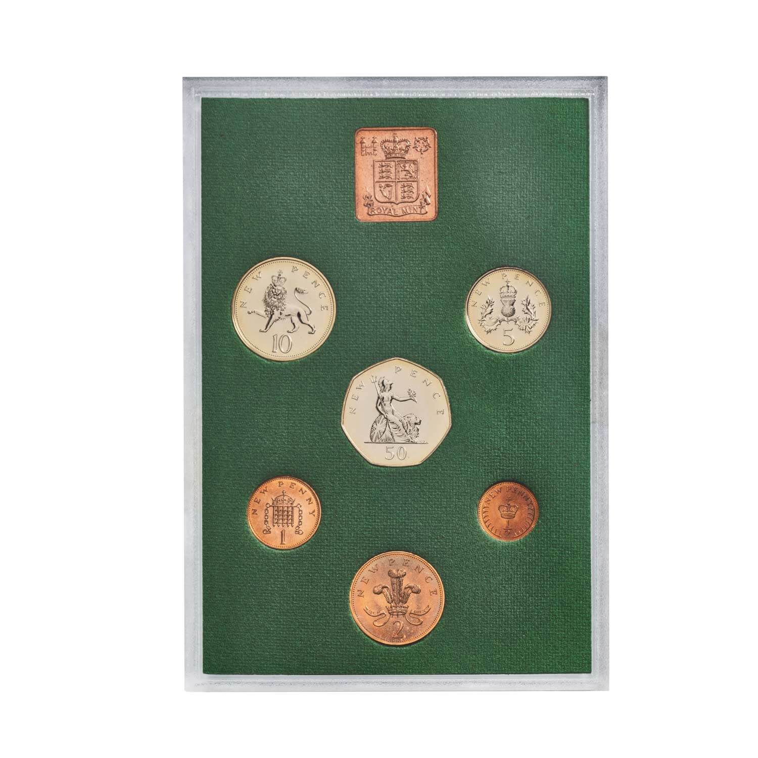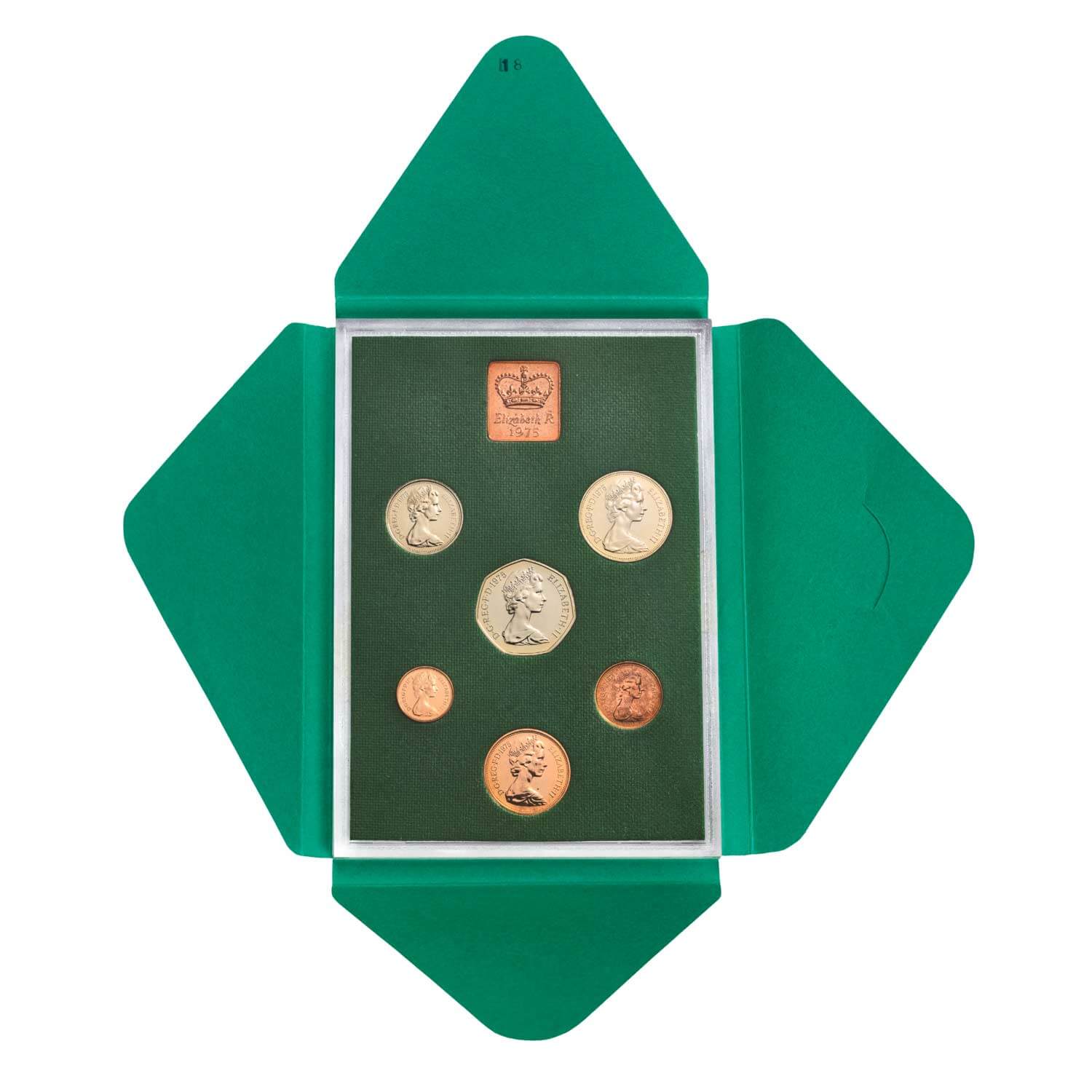 This set includes the six definitive UK coins from the year 1975. The decimal coins include a 50p, 10p, 5p, 20p, 1p and ½p coin. This set also includes a year-dated medal. Each of the coins in this set have been struck using base metal to Proof standard. The obverse of each coin features the second definitive coinage portrait of Queen Elizabeth II, designed by Arnold Machin.