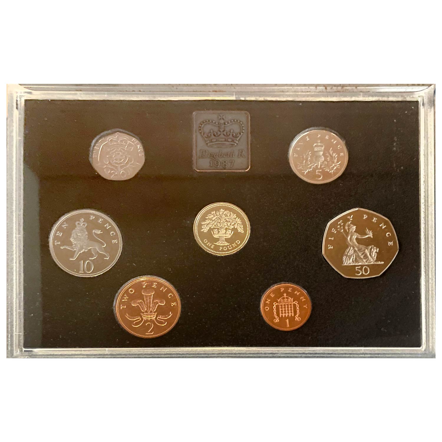 This 1987 Annual Proof Set contains the seven definitive UK coins struck that year. Each coin in the set has been struck to Proof standard. A 1987-dated medal celebrating Queen Elizabeth II with a crowned design completes the set. This set features the third coinage portrait of Queen Elizabeth II, designed by Raphael Maklouf. This Annual Set includes coins with the following denominations: £1, 50p, 20p, 10p, 5p, 2p and 1p.