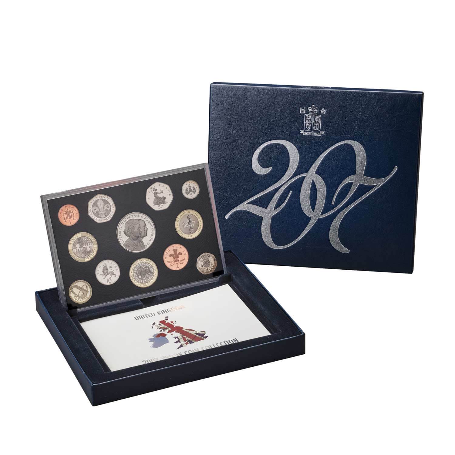 This 2007 Annual Proof Coin Set brings together 12 coins, including eight definitive UK coins from the £1 through to the 1p. Dated 2007, each coin has been struck in base metal to Proof standard. The 50p, 10p, 5p, 2p and 1p in 2007 were the last to feature designs by Christopher Ironside on the reverse, which had featured on the coins for nearly 40 years.