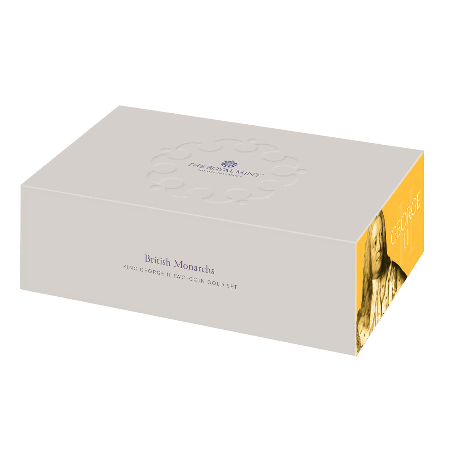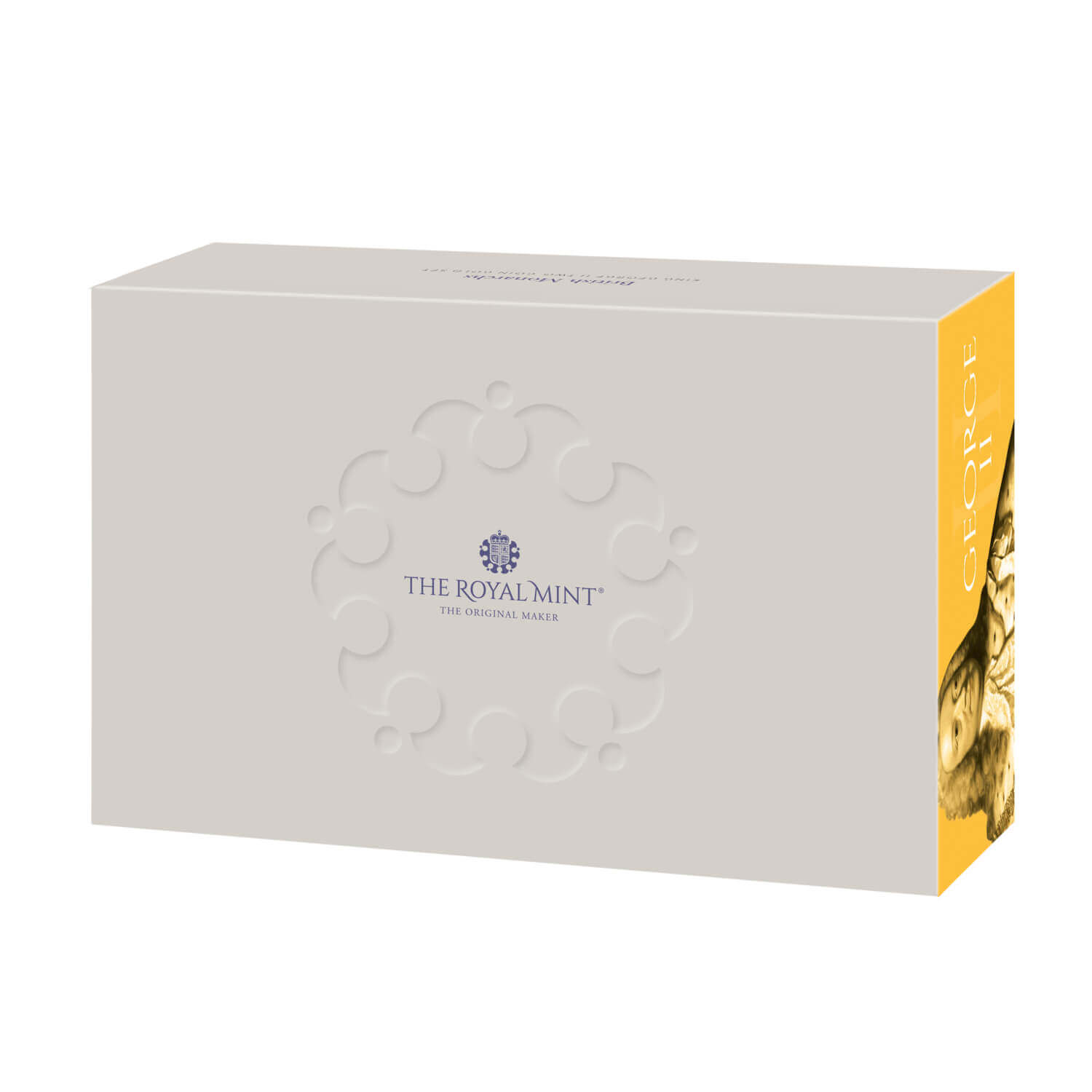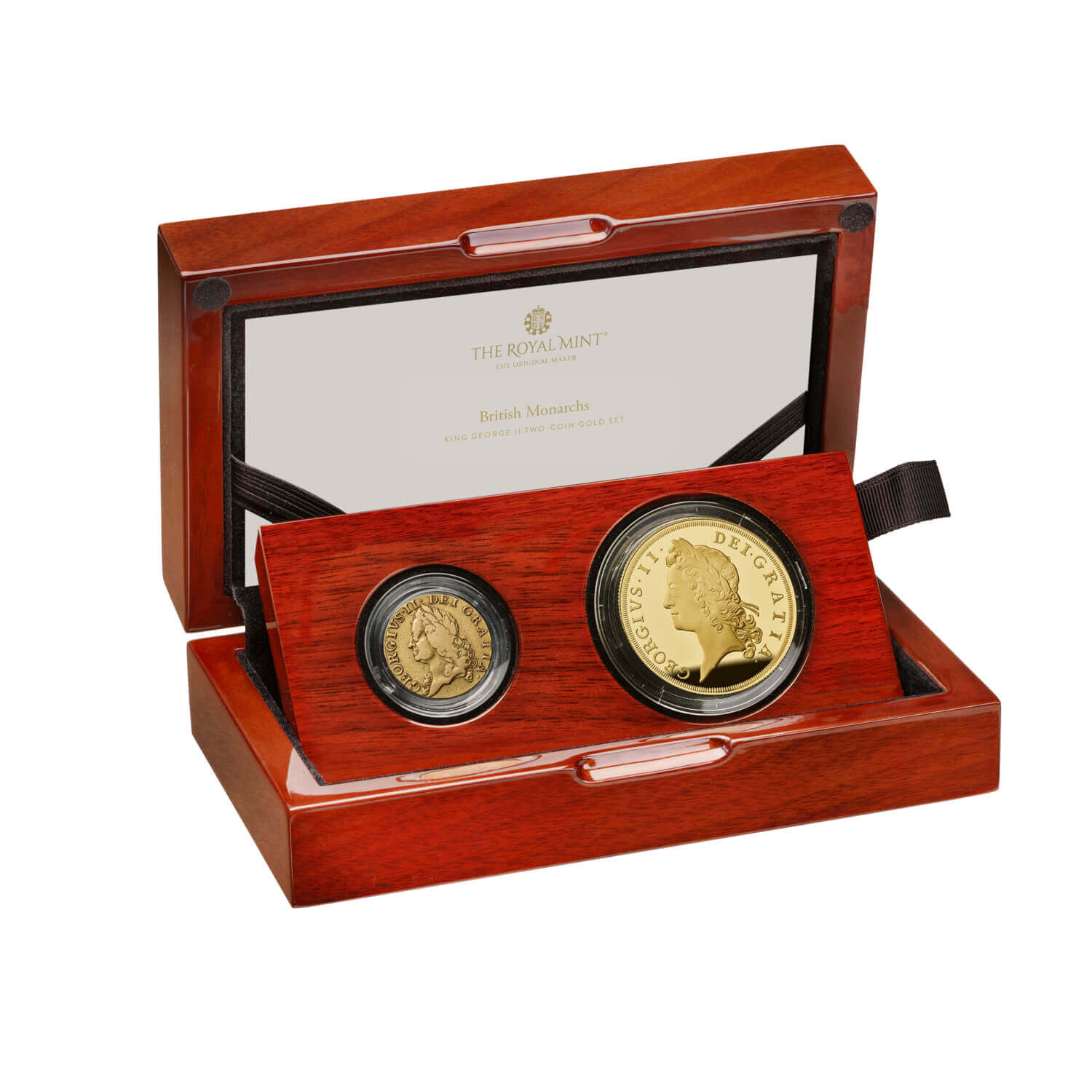 The British Monarchs King George II Two-Coin Gold Set brings together a two-ounce gold Proof commemorative coin and a historic guinea struck during the monarch’s reign. The two-coin set is available in a Limited Edition Presentation of just 20 sets.